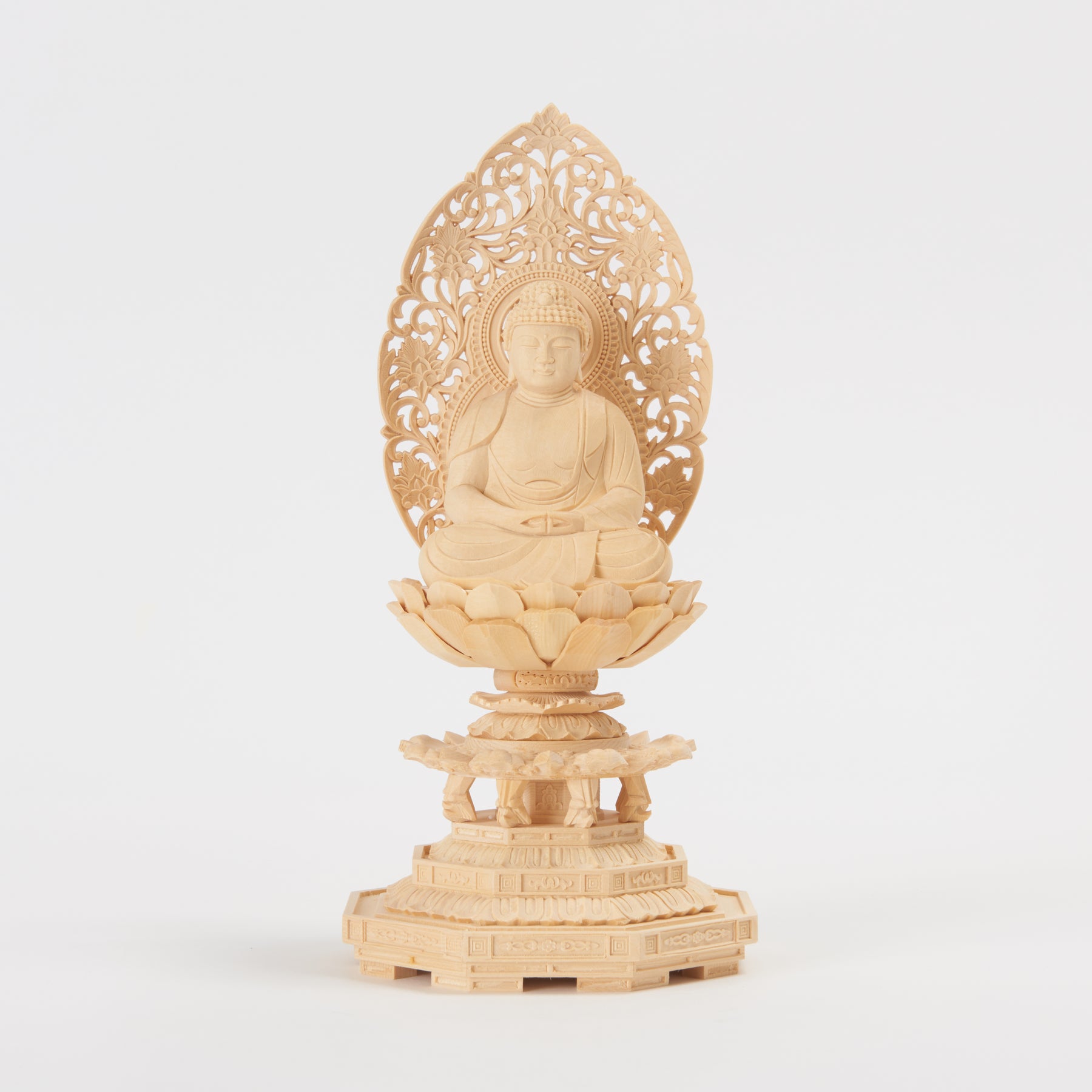 This statue is made by wood carving in hinoki (Japanese cypress), a pale, fine-grained wood valued for its clean look and soft warmth. The form follows the established Amida Nyorai model commonly used for household and temple images, shaped with balanced proportions and a calm, symmetrical posture. This type of figure exists within a long tradition of devotional sculpture, produced so the same recognizable form can be placed in a personal or shared setting as a consistent, familiar image.