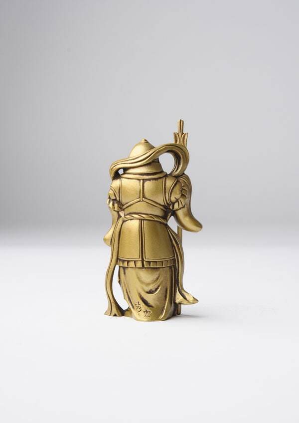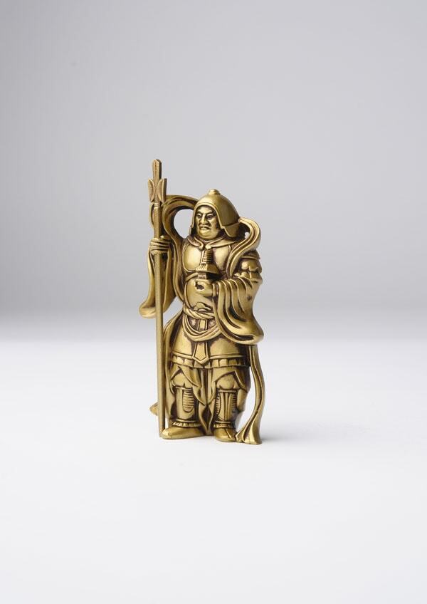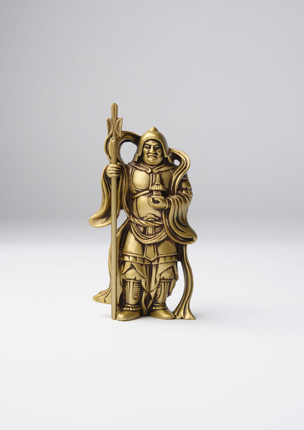 This sculpture is produced in zinc alloy using precision casting techniques associated with Takaoka Dōki, a metalworking tradition from Takaoka, Japan with more than four centuries of history. The model follows established Japanese iconographic conventions for Bishamonten as an armored guardian—typically shown with a weapon and a miniature pagoda—forms that developed through long workshop practice for Buddhist statuary and related ritual objects. The result is a small-scale work that emphasizes controlled detailing and refined surface finish, reflecting the continuity of Takaoka craftsmanship in durable, repeatable cast metal.