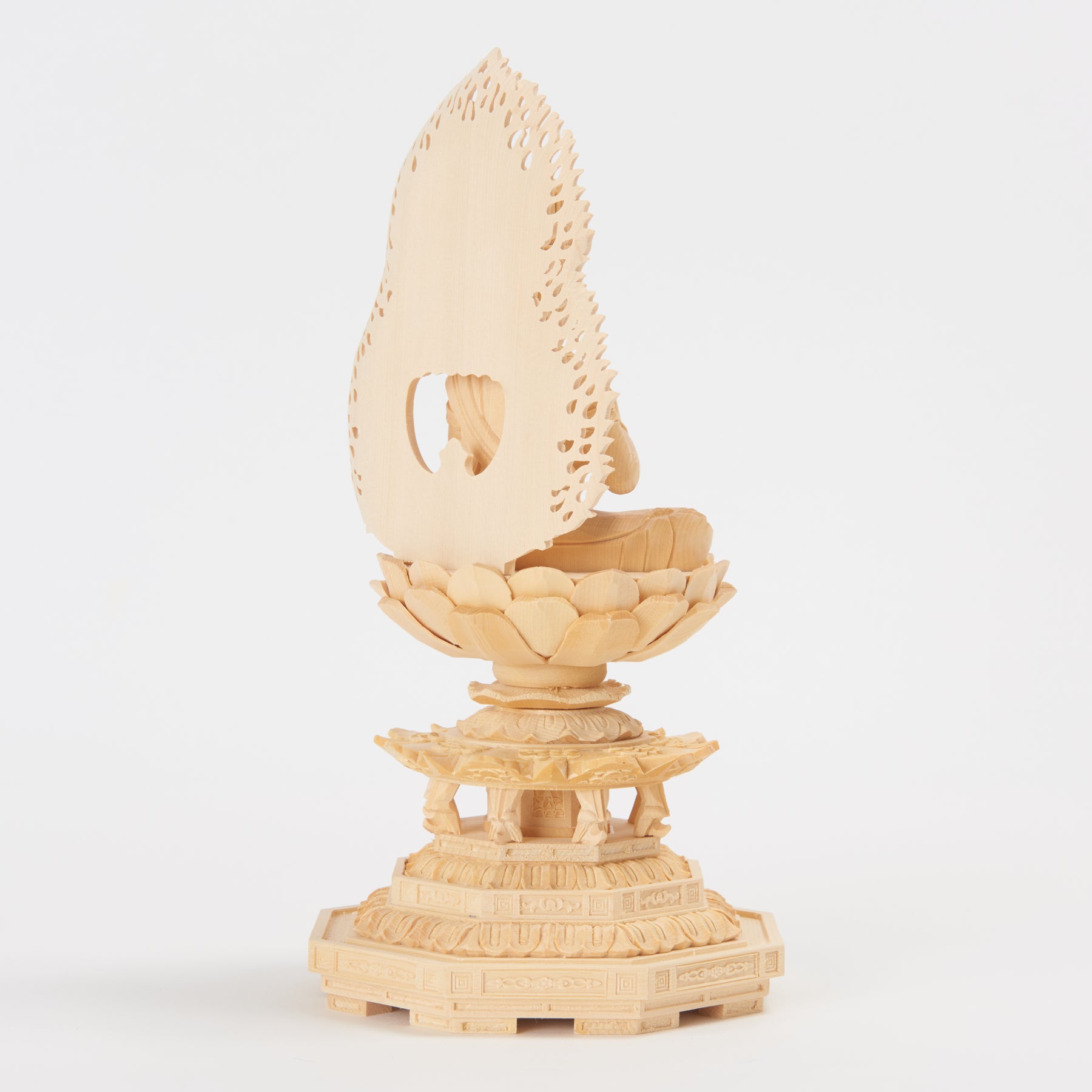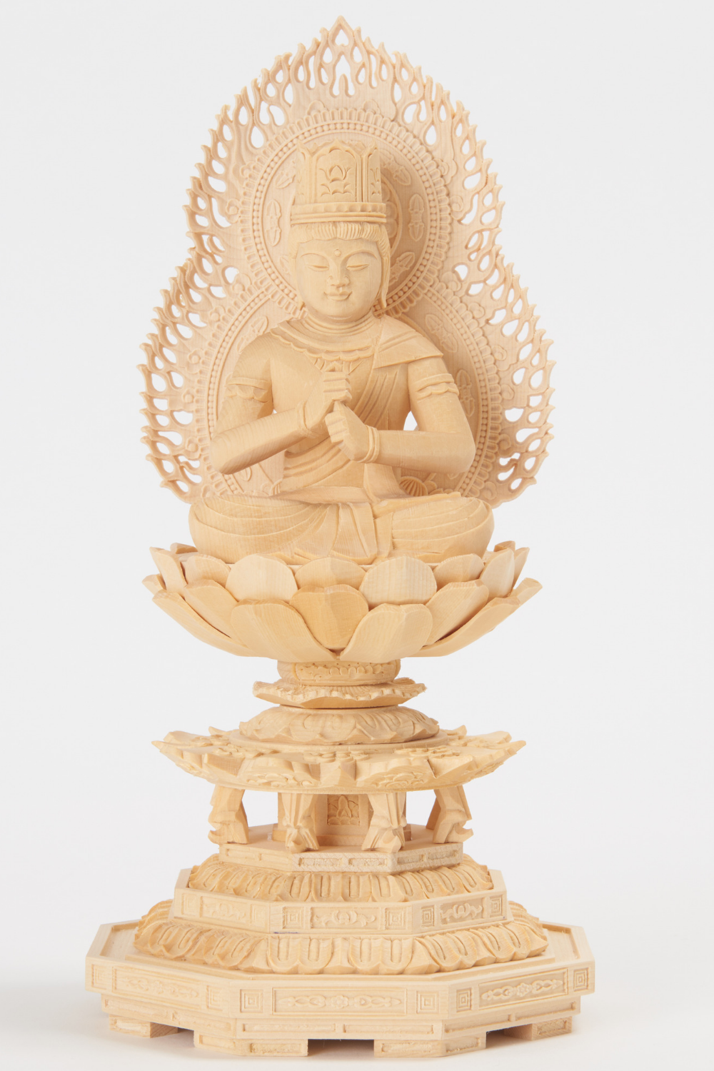 A hinoki-wood figure of Dainichi Nyorai (Mahāvairocana), made for a calm, centered presence in the room.
