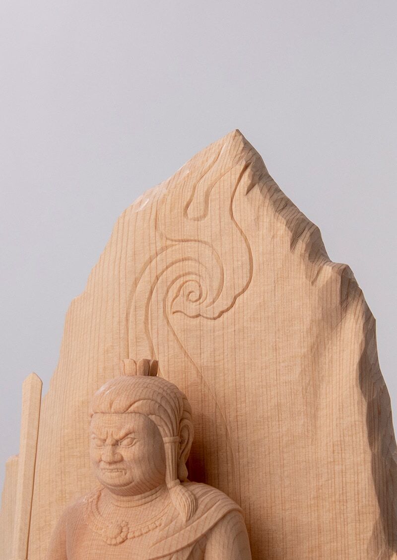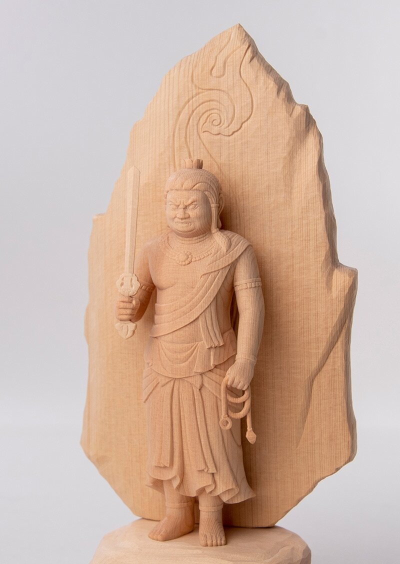 This is a hand-carved hinoki wood sculpture, made in Japan by Yoku Fujita. The work follows the long Japanese tradition of Buddhist wood sculpture, where forms are shaped directly from timber with careful attention to proportion, surface, and expression. In this model, the artist chooses a simplified, restrained approach—prioritizing clarity of silhouette and a calm face—reflecting a contemporary studio interpretation of a well-established iconographic subject.