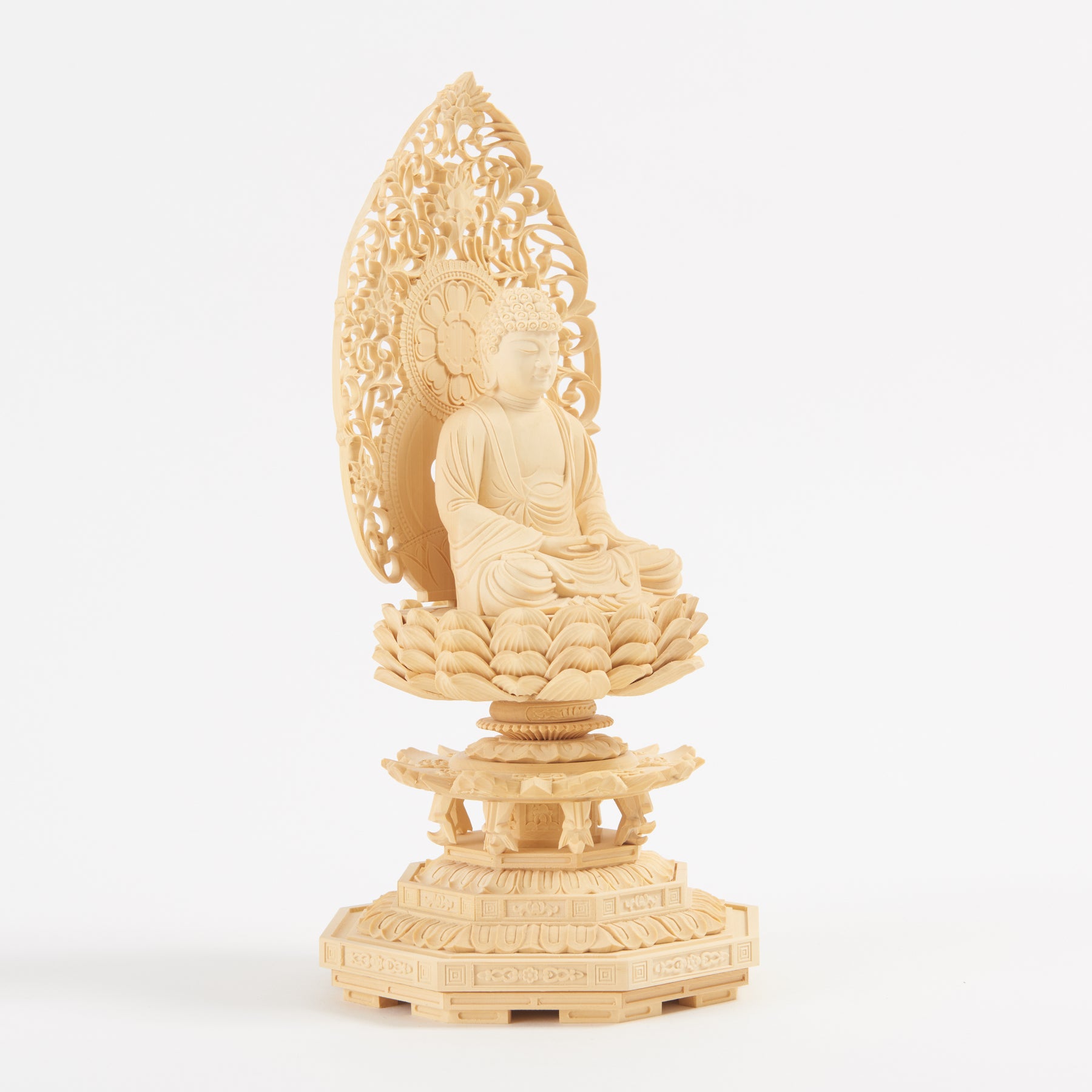 This statue is carved from tsuge (boxwood), a dense, fine-grained wood valued for holding crisp lines and a soft, even finish. The model follows the established “zazen” (seated meditation) format commonly used for Shaka Nyorai in Buddhist sculpture, with balanced proportions designed to read clearly from the front. This form exists as a standard devotional and contemplative image within temple and home traditions, where the seated Shaka is commissioned and reproduced as a stable, recognizable reference for practice spaces.