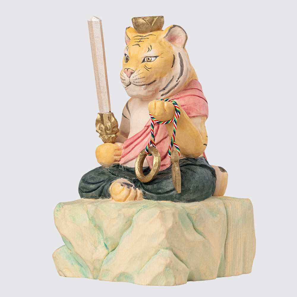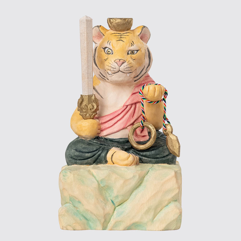This work is a carved hinoki figure with a five-colored rayon string detail. The model traces back to an original sculpture by contemporary artist Goh Sakai (Hotokeya Sakai), known for reinterpreting Buddhist figures through unexpected forms. Created within the lineage of Sakai’s modern folk-art approach (including his recognized Neko Butsu series), this tiger-form Fudō was developed as an alternative icon type—translating the steadfast, uncompromising character associated with Fudō Myō-ō into animal form. The piece is also associated with Mikamo Fudō Temple, where such images are connected to established temple traditions and ritual culture.