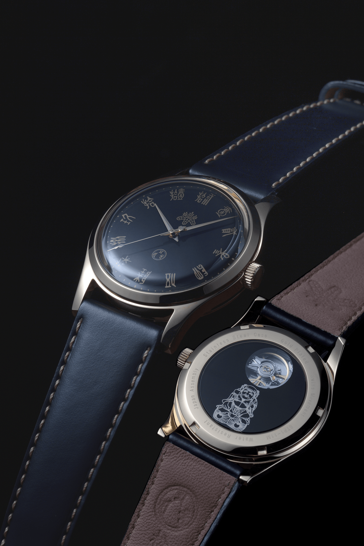 This timepiece is produced in Japan with a gold IP–finished case, black dial, and a custom strap in Matsusaka leather. It uses a Swiss-made hand-wound Cal. STP1-11M movement (a hand-wound specification selected for this model, even though the STP1-11 is commonly seen as an automatic base). The design draws on historical references to Sanmen Daikokuten as associated with Toyotomi Hideyoshi’s late-medieval patronage and the broader period practice of commissioning and circulating images that condensed multiple revered figures into a single, recognizable form. Every visible component—dial, caseback design, hands, and strap—is customized to support that unified model.