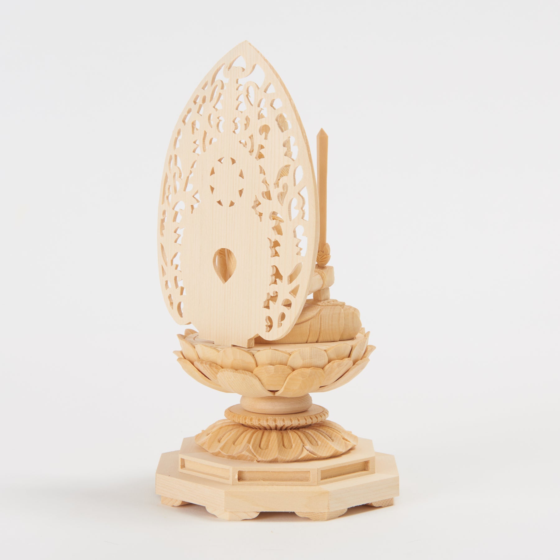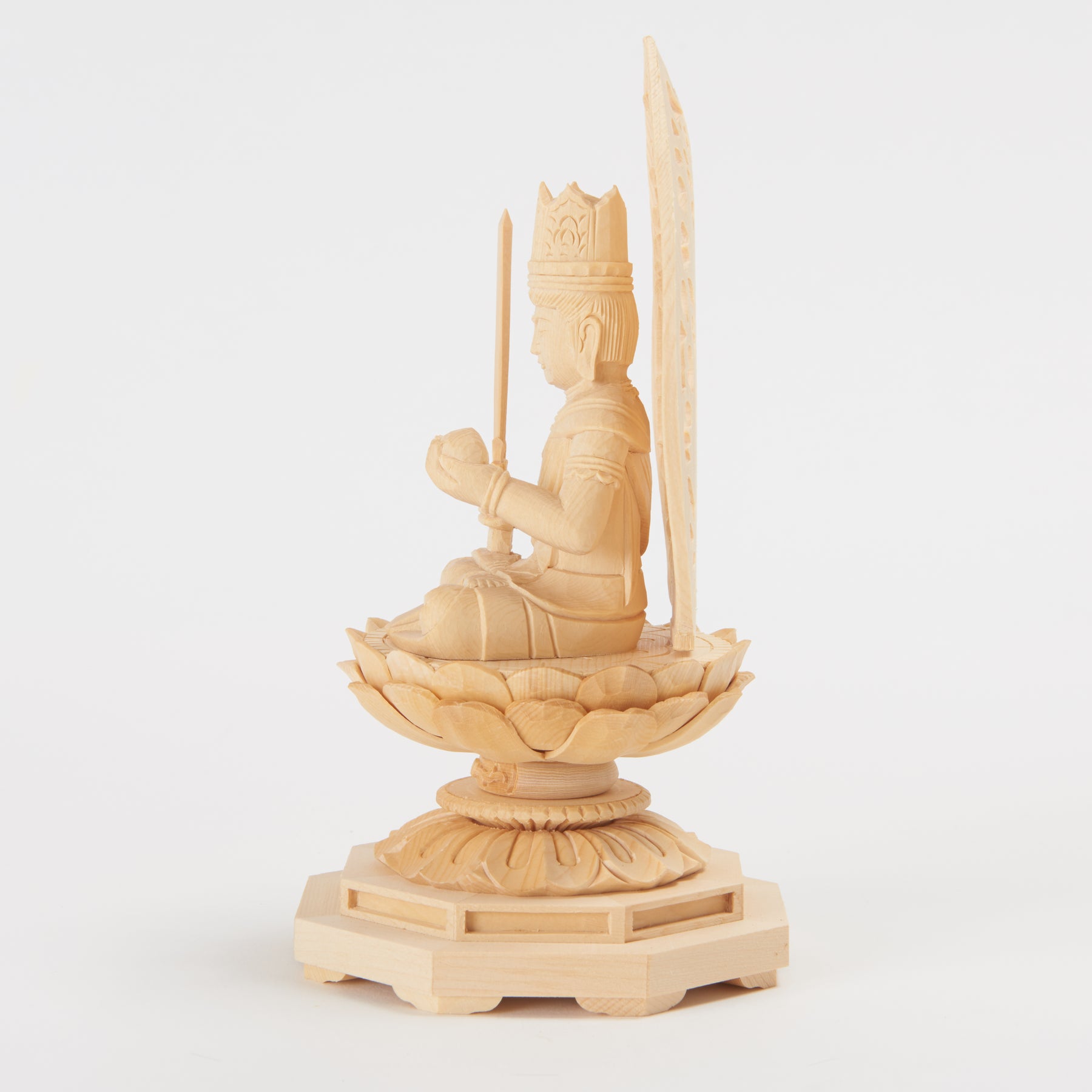Carved from hinoki wood and finished to highlight the clean grain and gentle contours, this Kokuzo Bosatsu statue is made as a small-format devotional-style figure based on established Japanese Buddhist iconographic models. The form follows the conventional workshop approach used for home display pieces—careful carving, smoothing, and a restrained finish—so the silhouette and facial expression read clearly at close viewing distance.