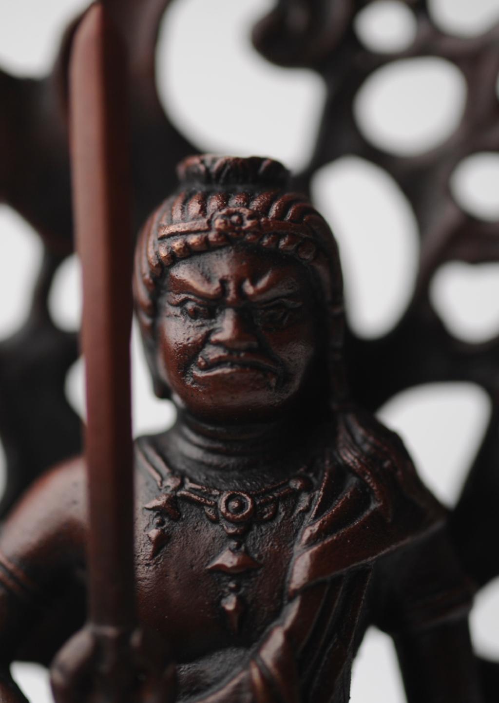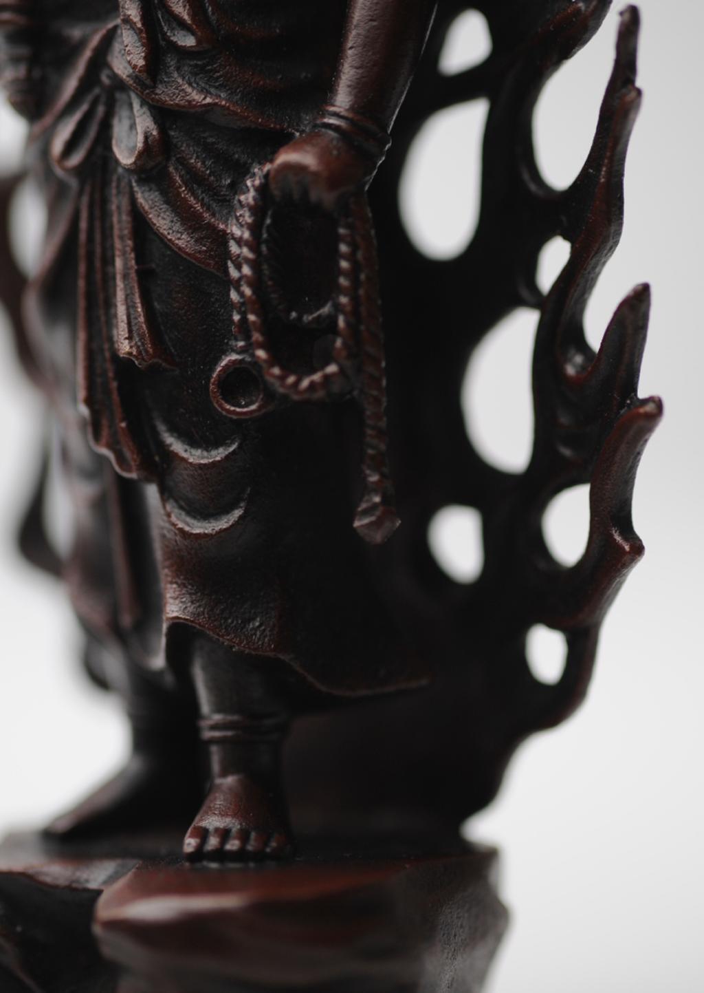 This work is produced through bronze casting using techniques associated with Takaoka Dōki, a metalworking tradition that originated in Takaoka, Japan and has continued for over four centuries. The model follows established iconographic patterns used for Buddhist statuary and ritual objects, developed within workshop lineages to preserve consistent proportions, attributes, and surface expression across generations. Pieces in this form exist as part of that long-standing sculptural tradition, where standardized models support faithful reproduction and refined finishing in bronze.