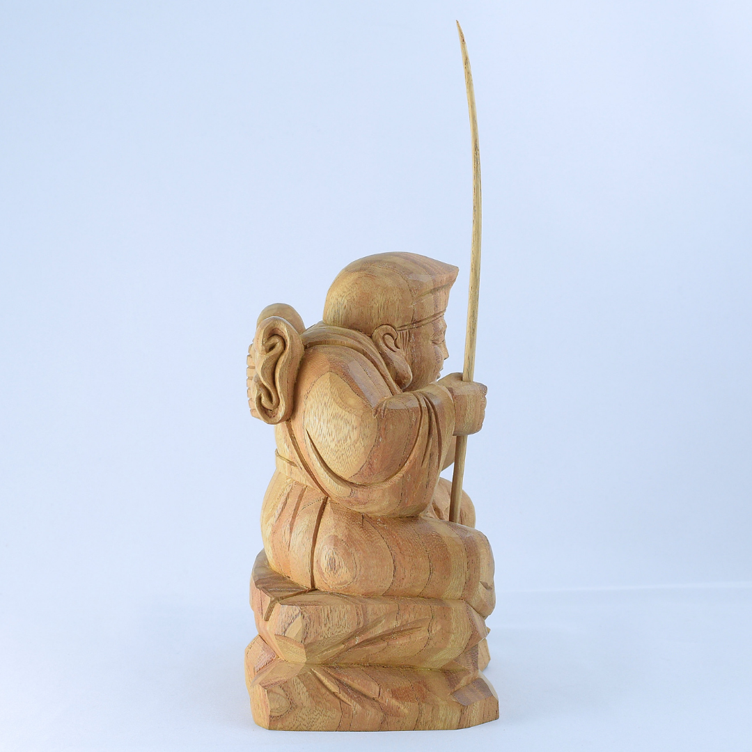 Carved from Keyaki (zelkova) wood, this Daikokuten figure is made as a compact, self-contained sculpture with clearly defined attributes—the mallet and the sack—integrated into the seated composition. The model follows a widely recognized Daikokuten iconographic type long used in Japanese devotional and decorative sculpture, where the attributes are essential to identifying the figure at a glance. This form is commonly produced for home and workplace settings as a practical, approachable representation within the broader tradition of the Seven Lucky Gods imagery.