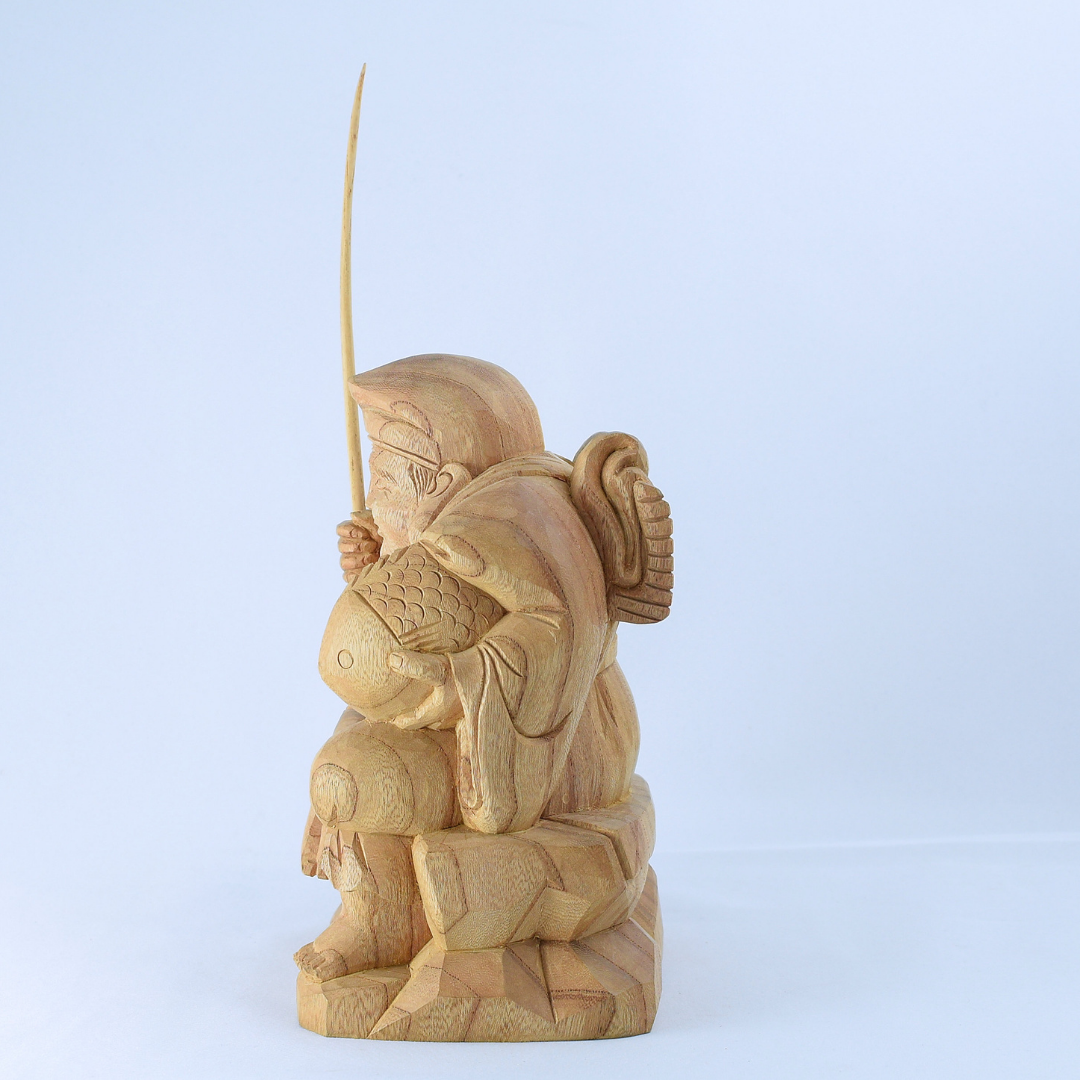 Daikokuten is shown seated in a calm, steady posture, holding a mallet and a sack—an enduring form associated with everyday abundance and the kind of prosperity that supports work, family, and continuity.
