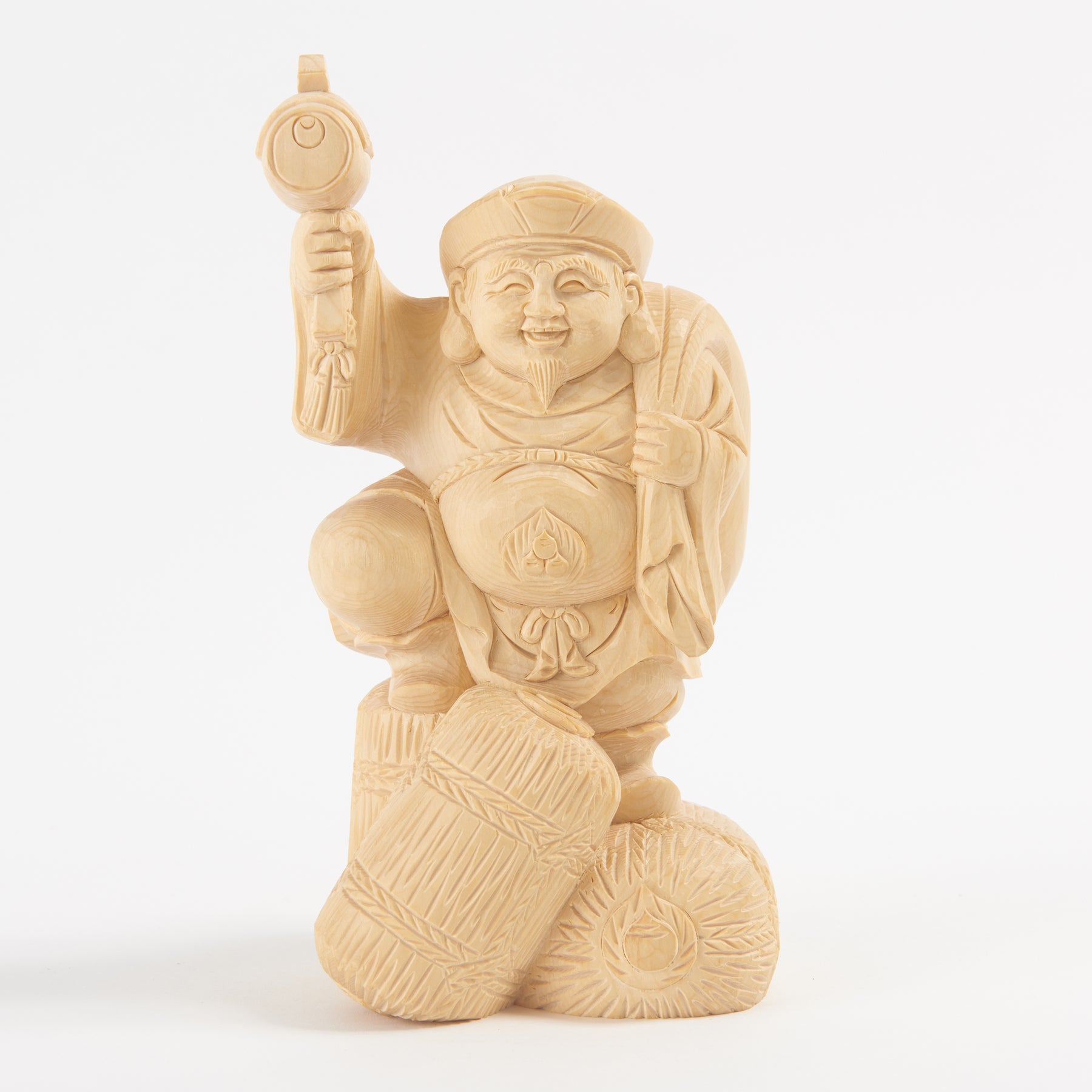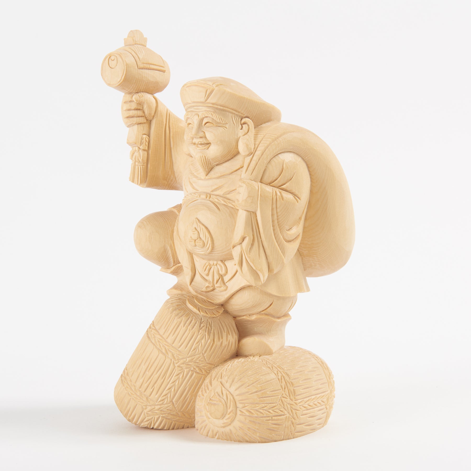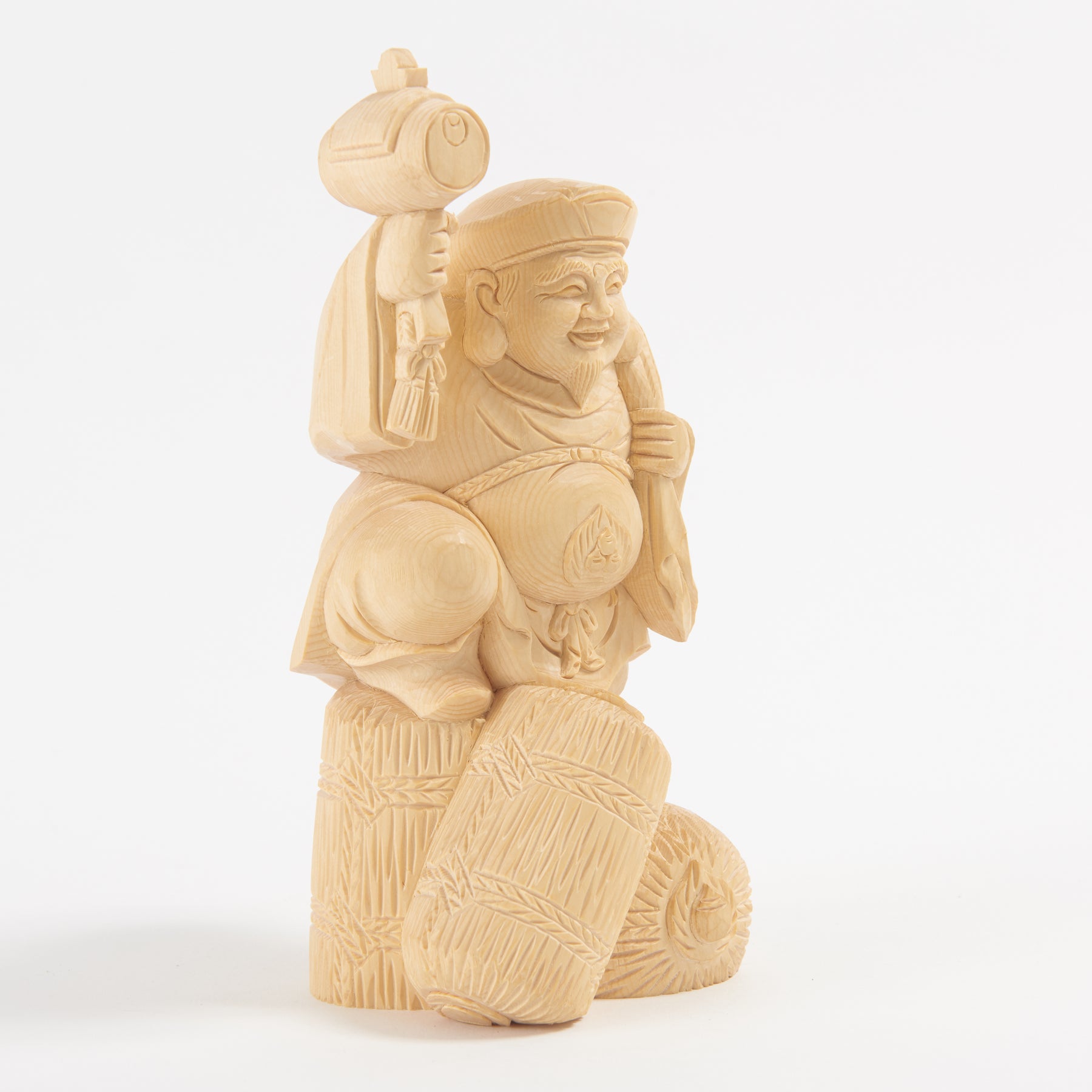 This statue is carved from hinoki (Japanese cypress), a fine-grained wood long valued for clean detail and a gentle, natural presence. The model follows the established Nihyo Daikoku iconography—Daikokuten poised on two rice bales—an enduring household and workplace form that developed through popular devotion and workshop tradition as a visual expression of “abundance that stays,” kept in reserve for daily needs and what comes next.