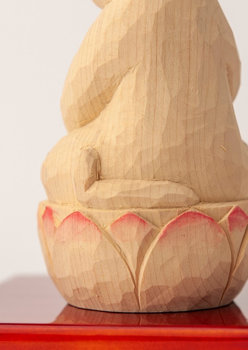 木曾檜(きそひのき)を用い、日本の仏師が一点ずつ手仕事で彫り上げる木彫作品です。小像ながら、面相(顔立ち)や合掌の手元に繊細な起伏をつけ、木目の表情を活かしながら端正にまとめています。本作は、伝統的な仏像制作の技法と工程を踏まえつつ、猫という身近なモチーフに合掌の所作を重ねた現代的な造形として制作されるものです。