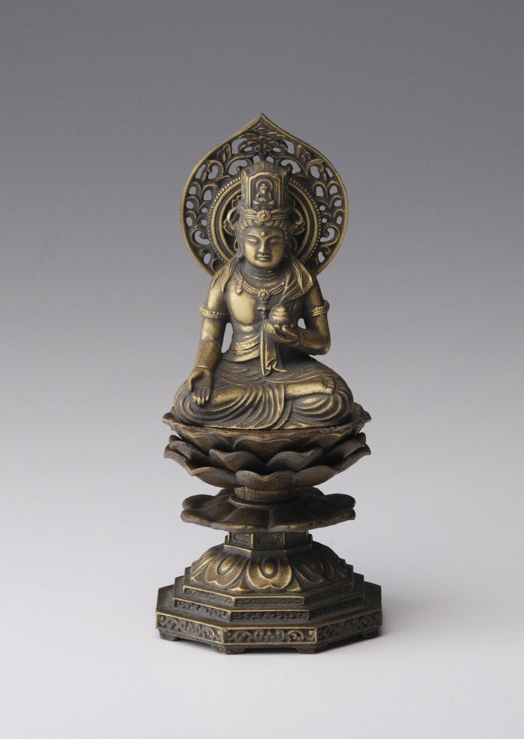 虚空蔵菩薩(こくうぞうぼさつ)を、落ち着いた古美金仕上げで表現した高岡銅器の仏像です。総高15cmのほどよいサイズ感で、日々の空間に静かな存在感を添えます。