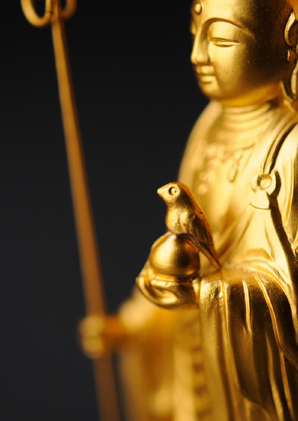 日本において地蔵菩薩は、道ばたや寺院などで身近に祀られ、人々の不安や願いを静かに受けとめる存在として親しまれてきました。とりわけ、声を上げにくい者や旅の安全、幼い命への祈りなどを託す対象として語られることが多く、像は「拝むための道具」というより、日々の心を整える拠り所として丁寧に扱われます。置く際は、清潔で落ち着ける場所を選び、感謝や追悼などの意図をもって向き合うのが一般的です。手に取るときも乱暴に扱わず、他の大切なものと同様に敬意をもって接してください。なお、選択により寺院での開眼供養(かいげんくよう)を行い、お名前入りの証明書を添えることがあります。