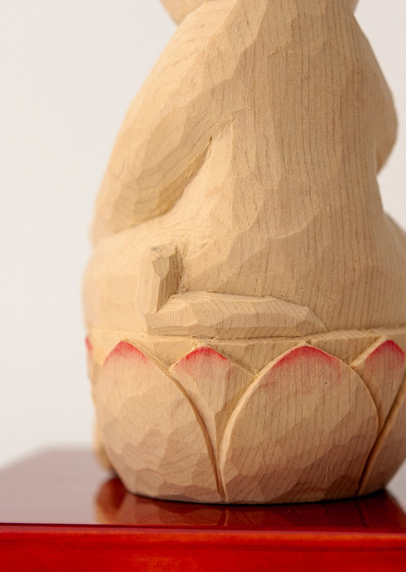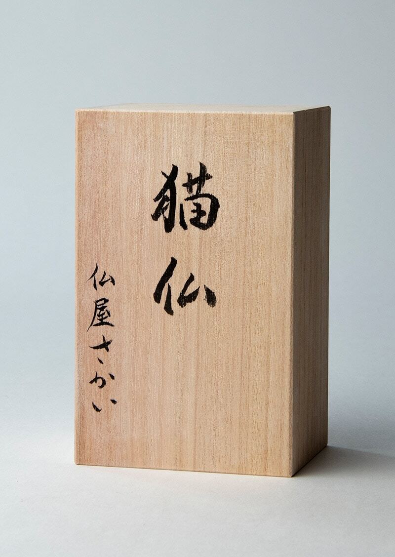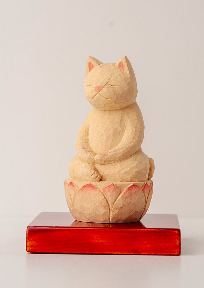 木曾檜(きそひのき)を用い、仏師が一点ずつ手仕事で仕上げる木彫作品です。猫が坐禅の姿勢で坐るという造形は、伝統的な仏像制作の技法を踏まえつつ、現代の暮らしの中で手元に置ける小像として依頼・制作されてきた系譜に連なります。小さな寸法の中に、背中の張り、脚の収まり、尾の静止といった要所をまとめ、木の質感を活かしながら端正に彫り出しています。