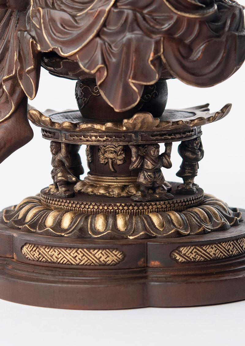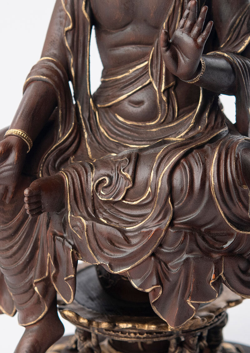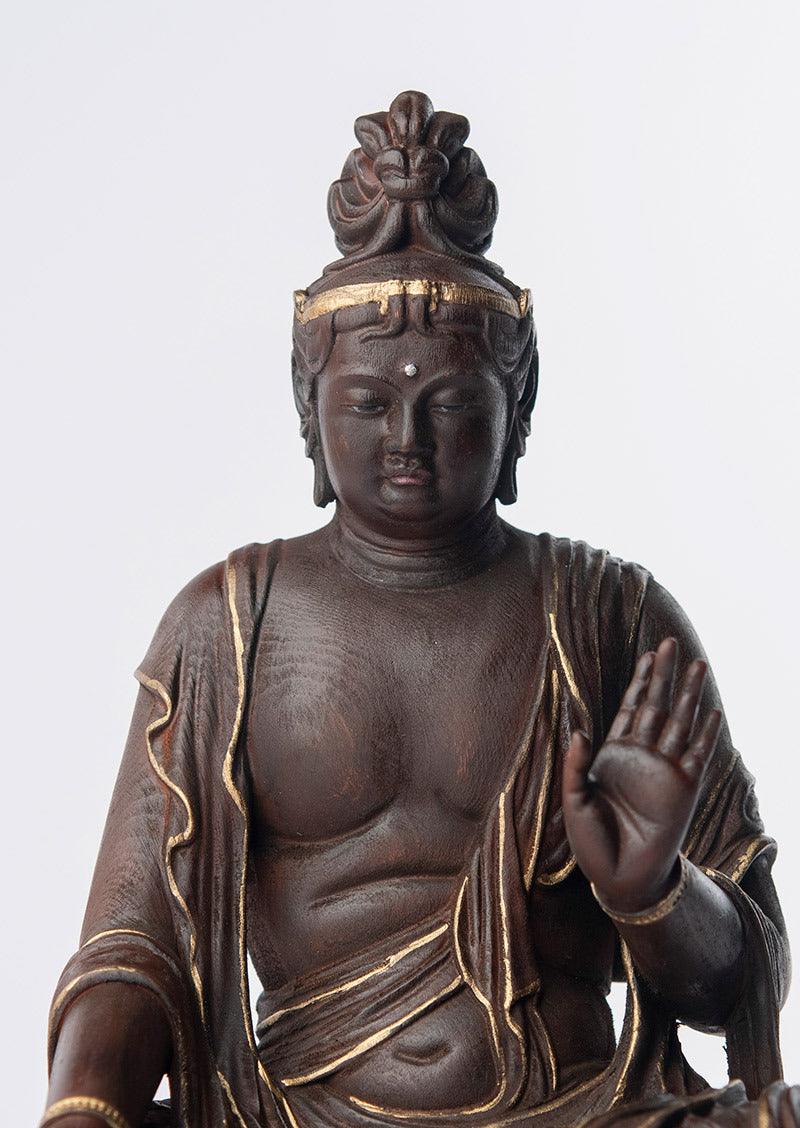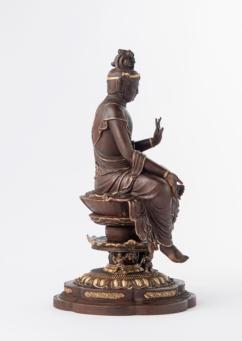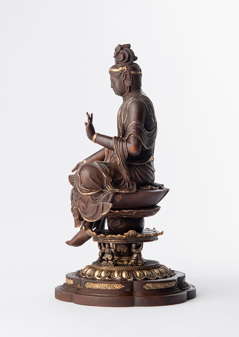本作は檜材を用いた木彫作品で、高精度の3Dデータによる造形設計と、職人の彫りによる仕上げを組み合わせて制作されています。形の正確さを担保しつつ、木の触感や立ち上がりを損なわないよう整えられているのが特徴です。仕上げの彩色は彩色師・高村千尋氏の監修のもとで行われ、木地の表情を活かしながら、面の奥行きと品のある陰影が与えられています。伝・如意輪観音の作例を参照した端正なプロポーションと、親密さのあるスケール感を両立させるための形式として、この姿が採られています。