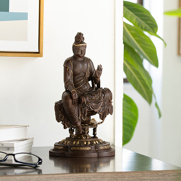 日本では、観音像は「観音さま」として親しまれ、寺院だけでなく家庭でも敬意をもって迎えられてきました。如意輪観音は観音菩薩の一尊として、願いに寄り添い、日々の安寧や心の整いを見守る存在として理解されることが多いお姿です。お迎えの際は、像を「飾り」や「インテリア」として扱うよりも、手を合わせる気持ちを大切にし、清潔で落ち着いた場所に安置するのが一般的です。移動やお手入れの際も、乱暴に扱わず、両手で丁寧に取り扱うことが望ましいとされています。