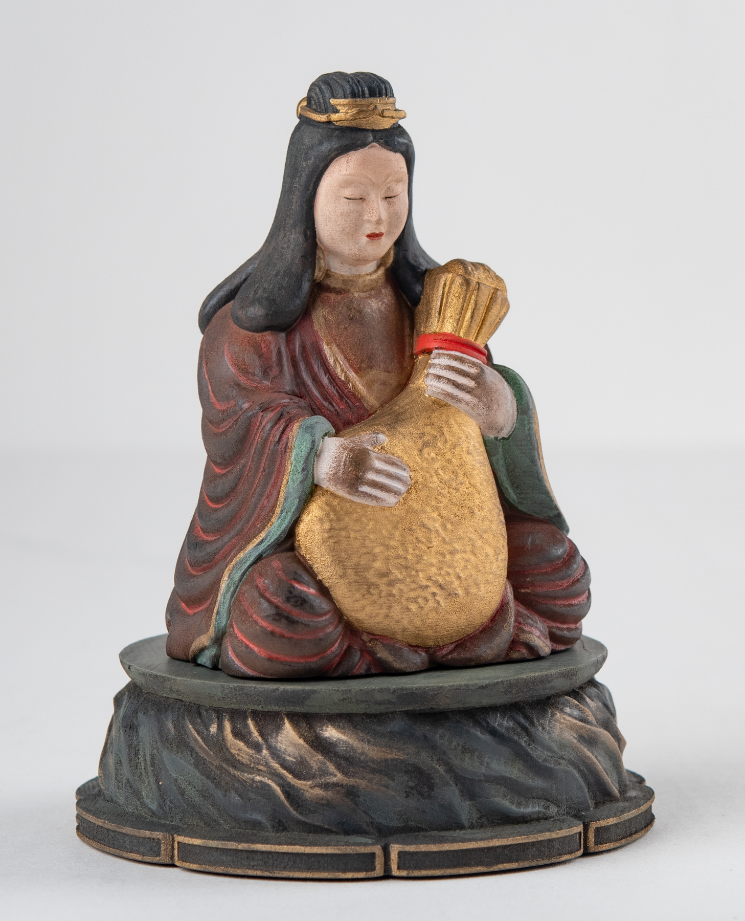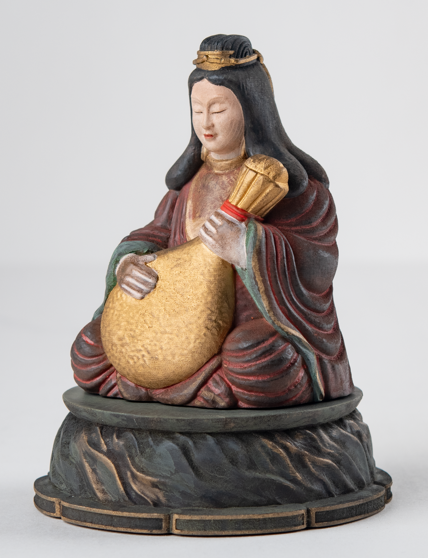 本作は檜(ひのき)材を用いた木彫仕上げの像で、龍王弁財天を表す伝承上の意匠として「琵琶袋に琵琶を収める」姿を取り入れています。モデルとなるのは、水澤観音として知られる五徳山水澤寺の境内・弁天池に祀られる龍王弁財天の伝承で、参詣者が霊泉の水を汲みに訪れる場としても語られてきた背景があります。こうした寺院の縁起や信仰の場に結びつく姿を、室内で扱いやすい小像としてまとめたものです。