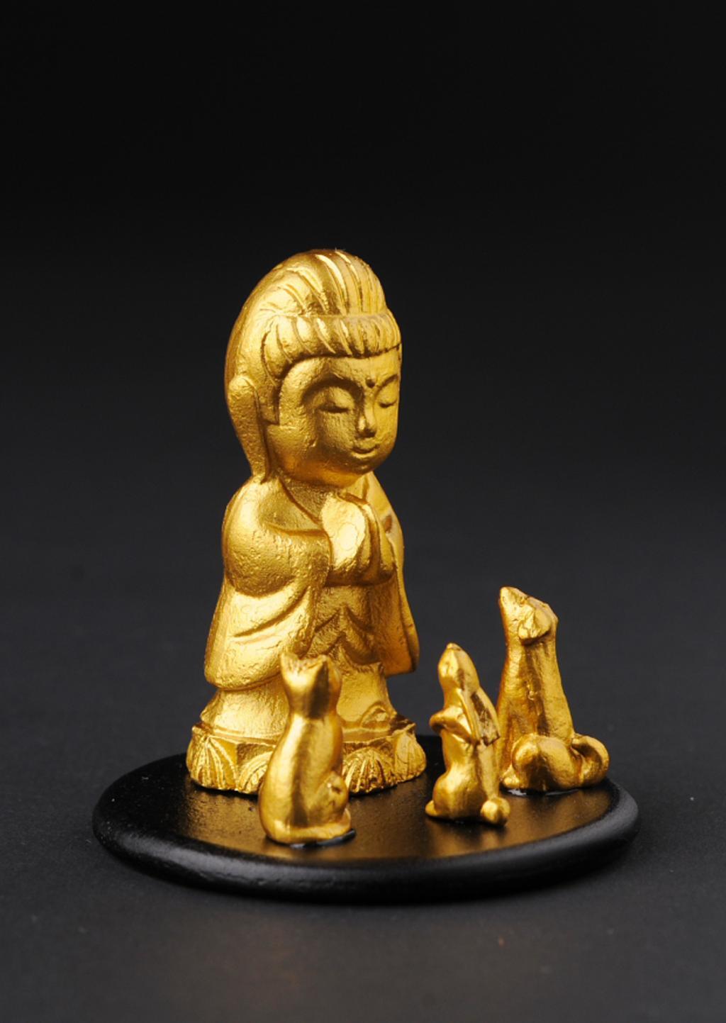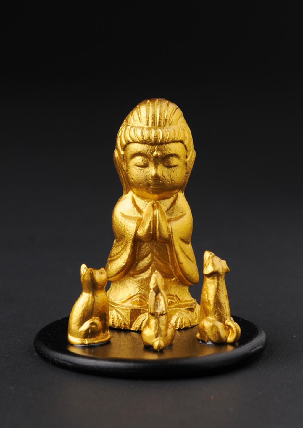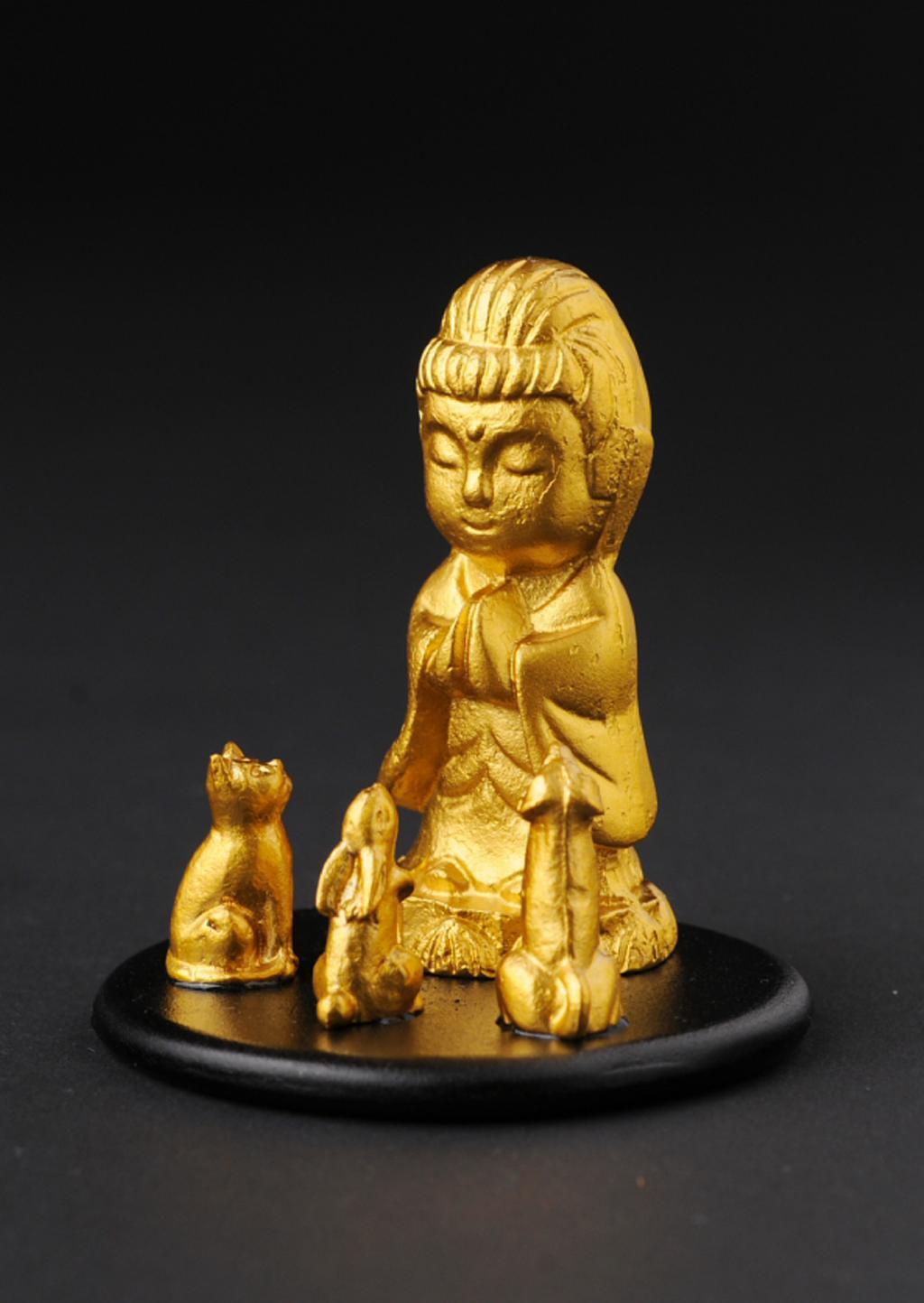 日本製の亜鉛合金製フィギュアで、金属成形(鋳造)によって細部の輪郭を整えた小像です。小型の観音像を日常空間に置けるようにまとめた現代の意匠で、ペットを身近に感じるための小さな祈りのかたちとして制作されています。ご希望により、出荷前に日本の寺院にて開眼供養(かいげんくよう)を行い、お名前を記した開眼証明書を同梱することも可能です。