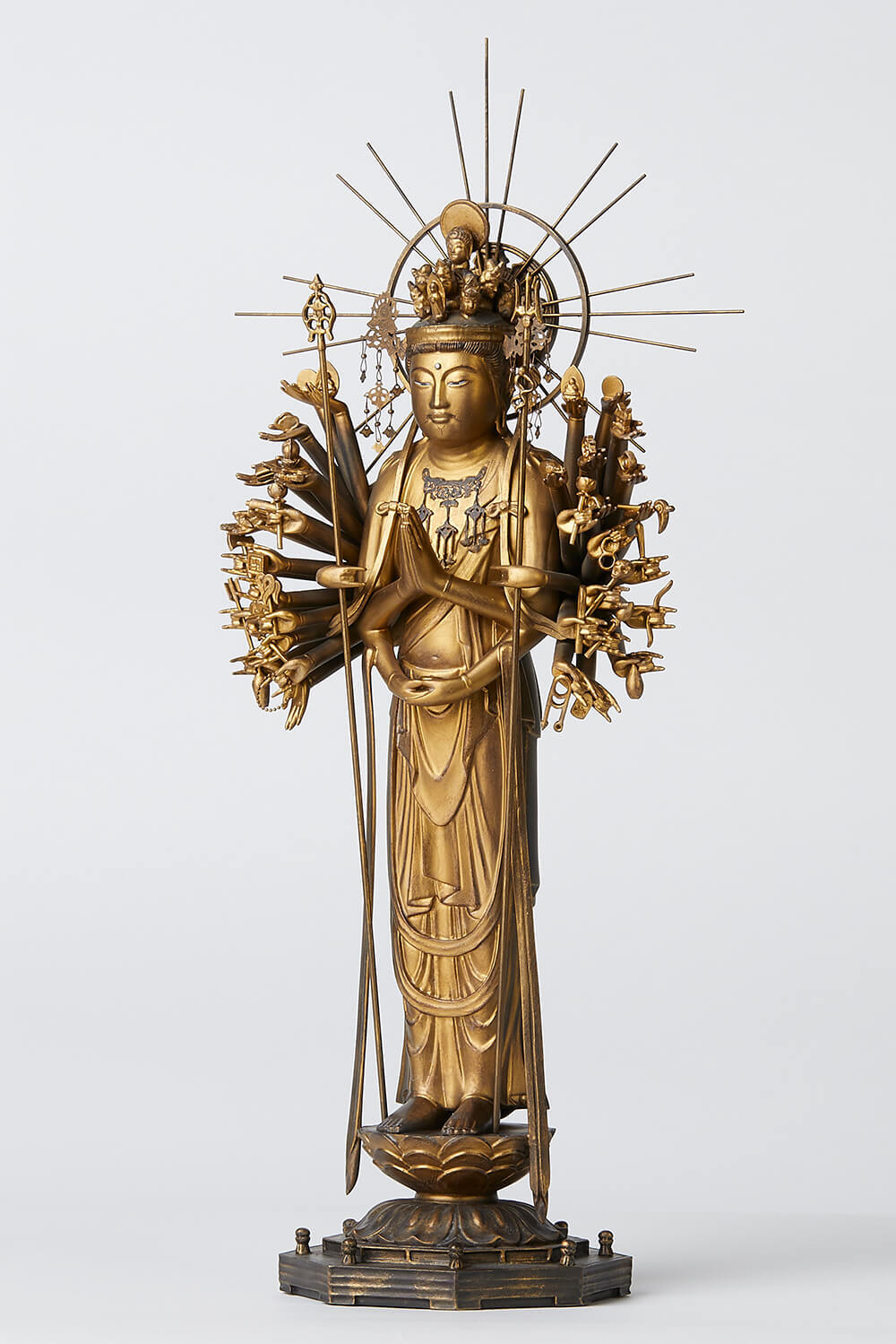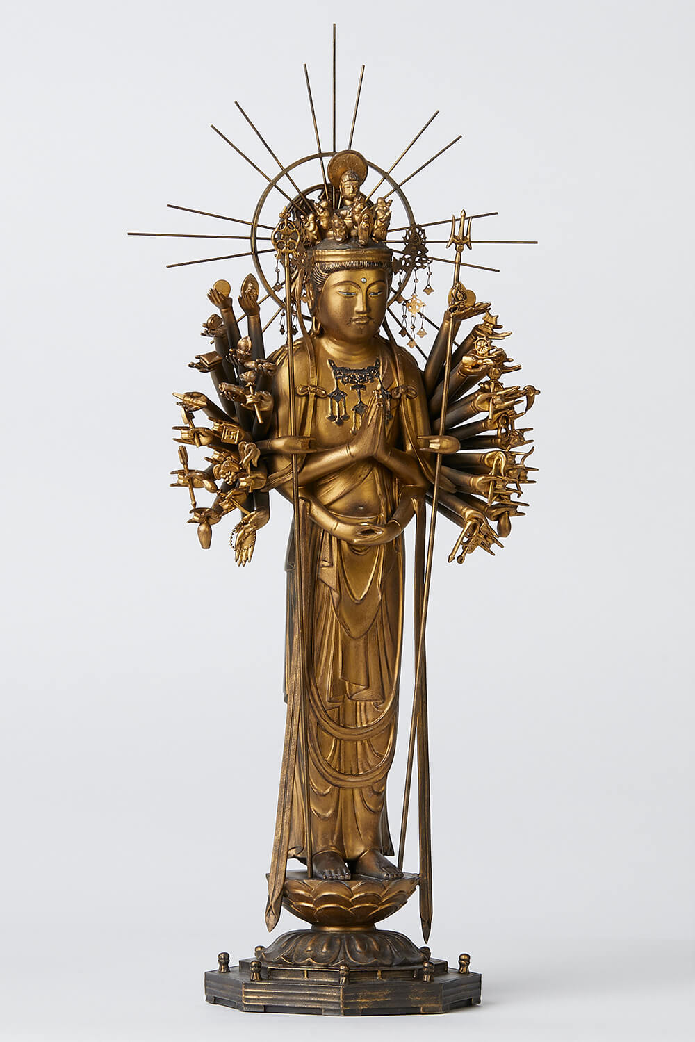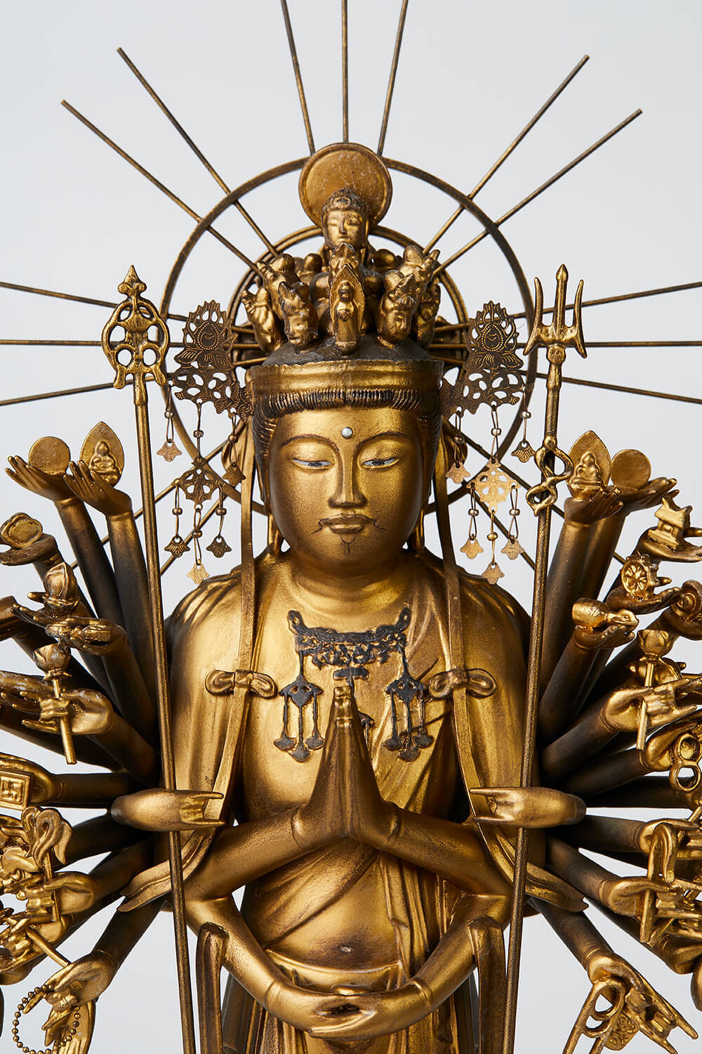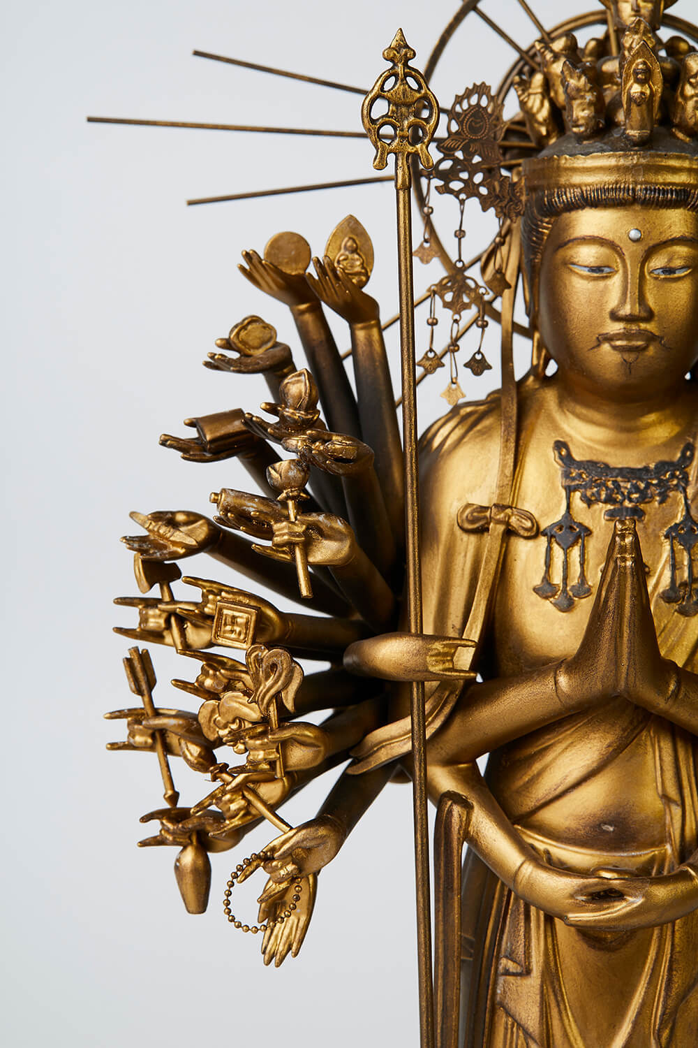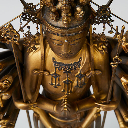 本作はポリストーン製の成形品に金色仕上げを施した像で、京都で制作された運慶の嫡子・湛慶(たんけい)による原像をもとにしたレプリカです。湛慶は鎌倉期の仏師集団として知られる慶派に属し、写実性と量感、動勢を重んじた作風で仏像彫刻の流れを形づくりました。千手観音という定型は、複数の面と多数の手を一体にまとめる伝統的な造形規範として各時代・各地で継承され、寺院造像や信仰の場の要請に応じて発展してきた形式であり、本作もその系譜を参照して造形を整えています。