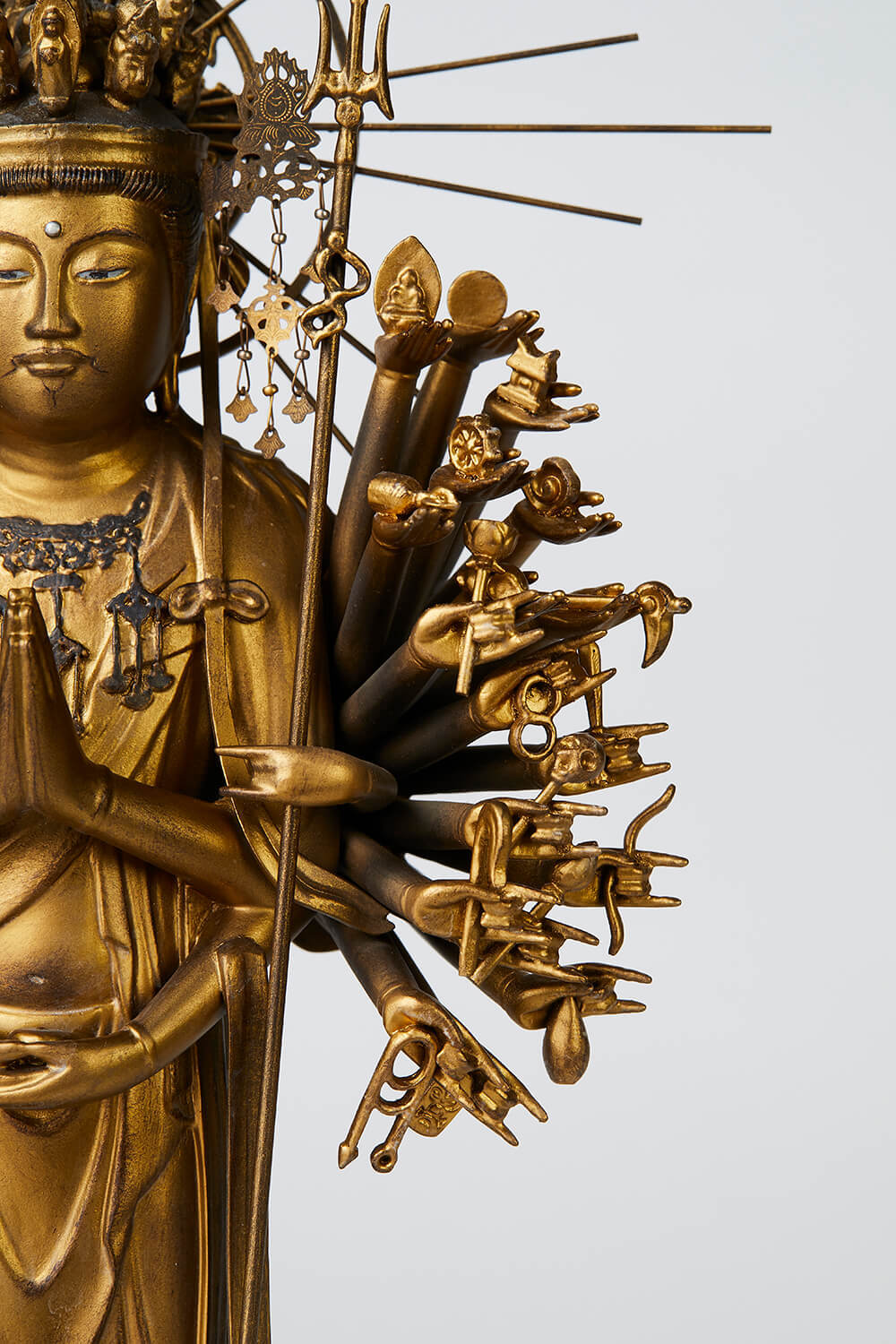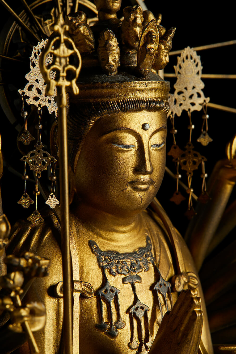 千手観音(千手観世音菩薩)を、穏やかな佇まいのまま立体としてまとめた「慶派金色」仕上げの像です。十一面と多臂という複雑な構成でありながら、全体の印象は静かで、表情も落ち着きがあります。