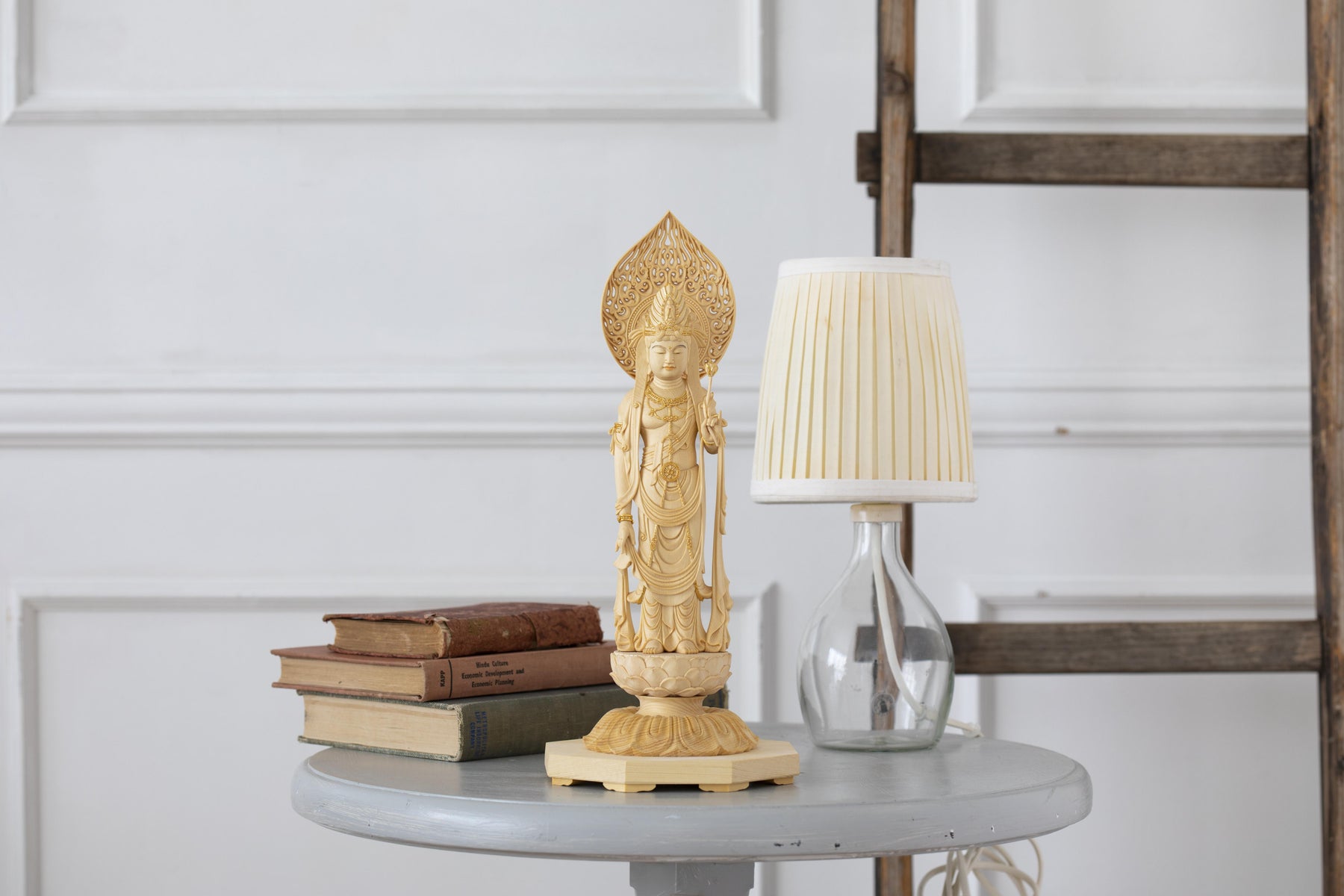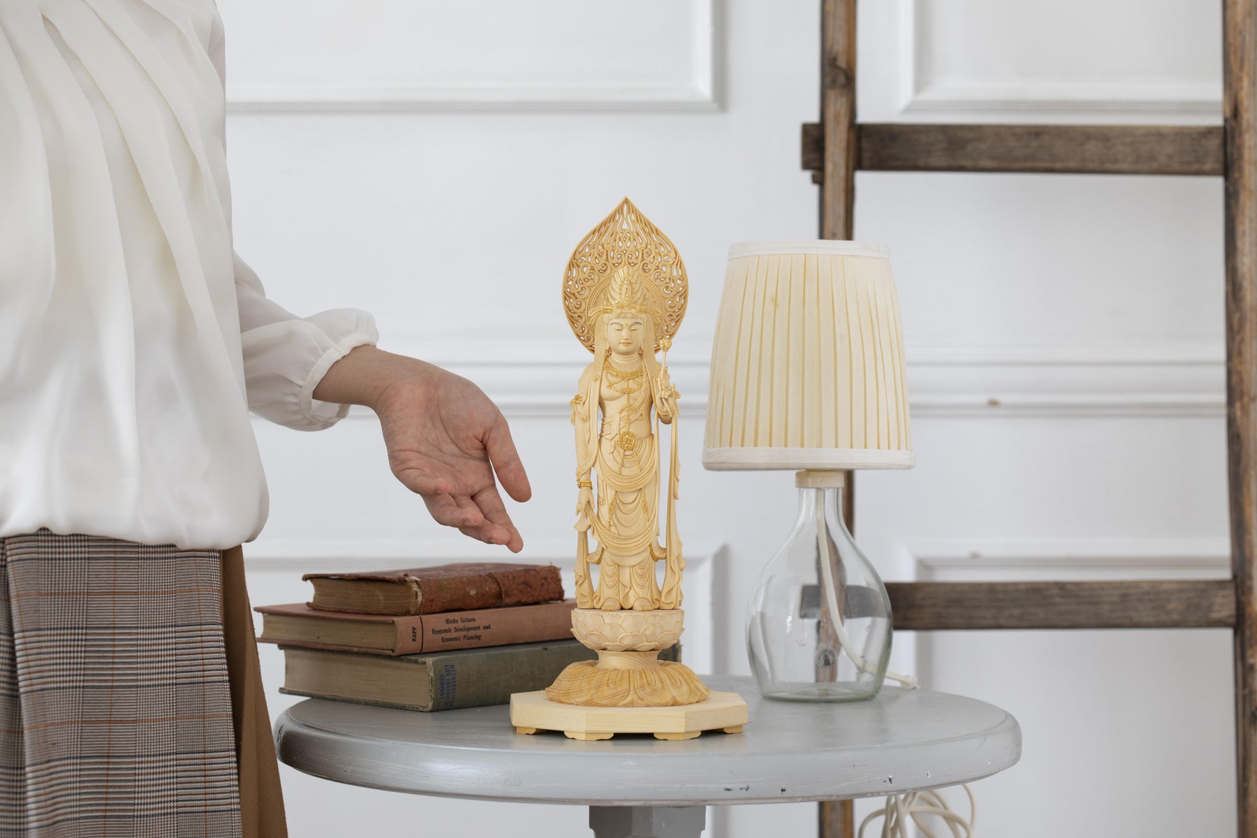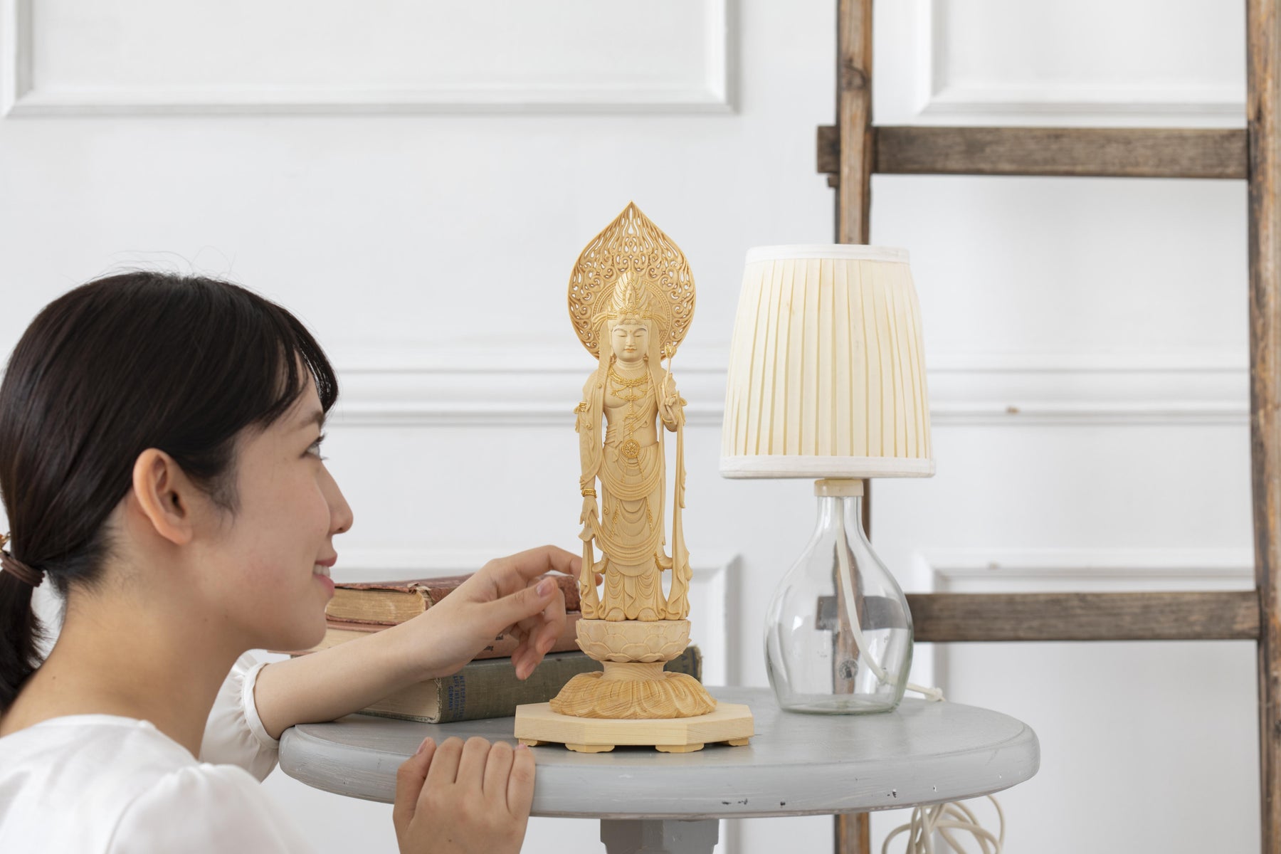 日本では観音菩薩は、苦しみの声に耳を傾ける存在として広く信仰され、寺院だけでなく家庭でも大切にされてきました。なかでも聖観音は、象徴性を強く押し出す姿よりも、人に近い落ち着いた姿で表されることが多く、静かに手を合わせる対象として受け止められています。像を迎える際は、願いを誇示するよりも、日々の心を整える意図で向き合うのが一般的です。置き場所は清潔で落ち着く所を選び、目線より少し高い位置に安定して安置し、手に取るときは両手で丁寧に扱うなど、ものとして敬意をもって接することが大切にされています。