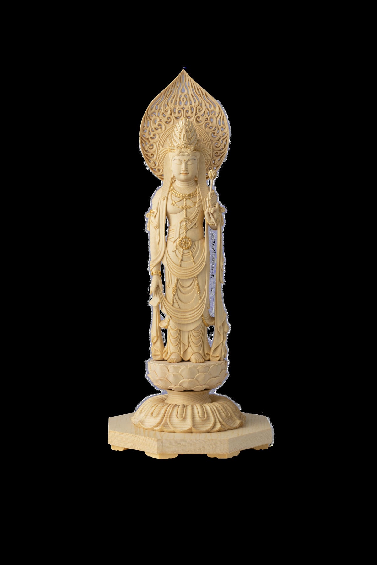 本作は、ひのき(日本産ヒノキ材)を用いた木彫仕上げの聖観音像です。直線と曲線の緩急を抑えた造形で、衣文や立ち姿の流れを簡潔にまとめ、穏やかな表情へ視線が集まるように構成されています。意匠は、日本で広く親しまれてきた観音像の基本形(単身で静かに立つ姿)を参照したもので、過度な装飾を避け、像としての端正さを大切にした作りです。制作は中国で行われています。