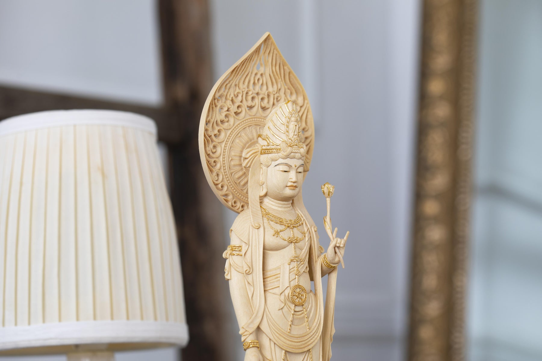 ひのき材ならではのやわらかな木肌と、端正な立ち姿が調和し、空間に落ち着いた印象をもたらします。日々の目線の高さに置きやすいサイズ感で、像としての存在感と扱いやすさのバランスを重視した方に向きます。