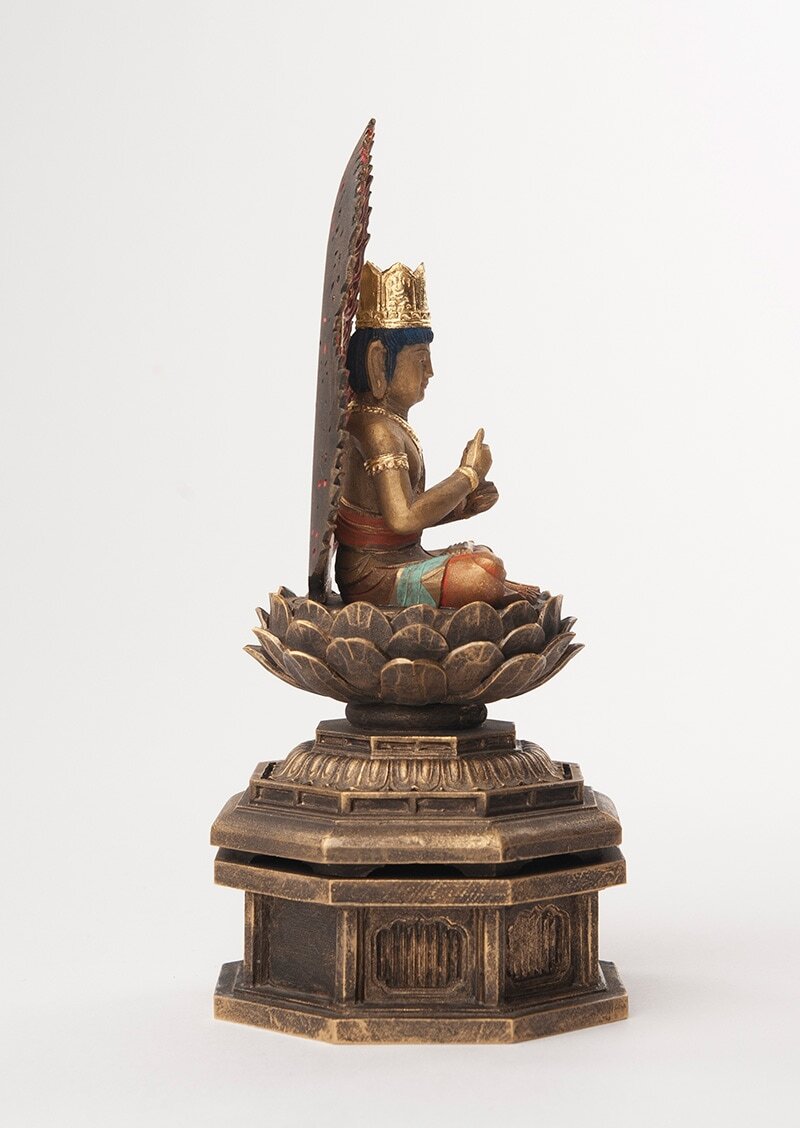 本作は檜(ひのき)を用いた木彫作品です。全体は古美(アンティーク調)の雰囲気を意識した仕上げで、時を経たような落ち着きが出るよう表情と面の取り方が整えられています。像容は、密教彫刻で広く参照されてきた大日如来の坐像形式に基づき、定型として受け継がれてきた姿を手がかりに制作されています。こうした形式は、寺院の本尊や修法の場に据える像として伝統的に求められてきたため、姿勢や手の形(印相)などが一定の約束に沿ってまとめられています。