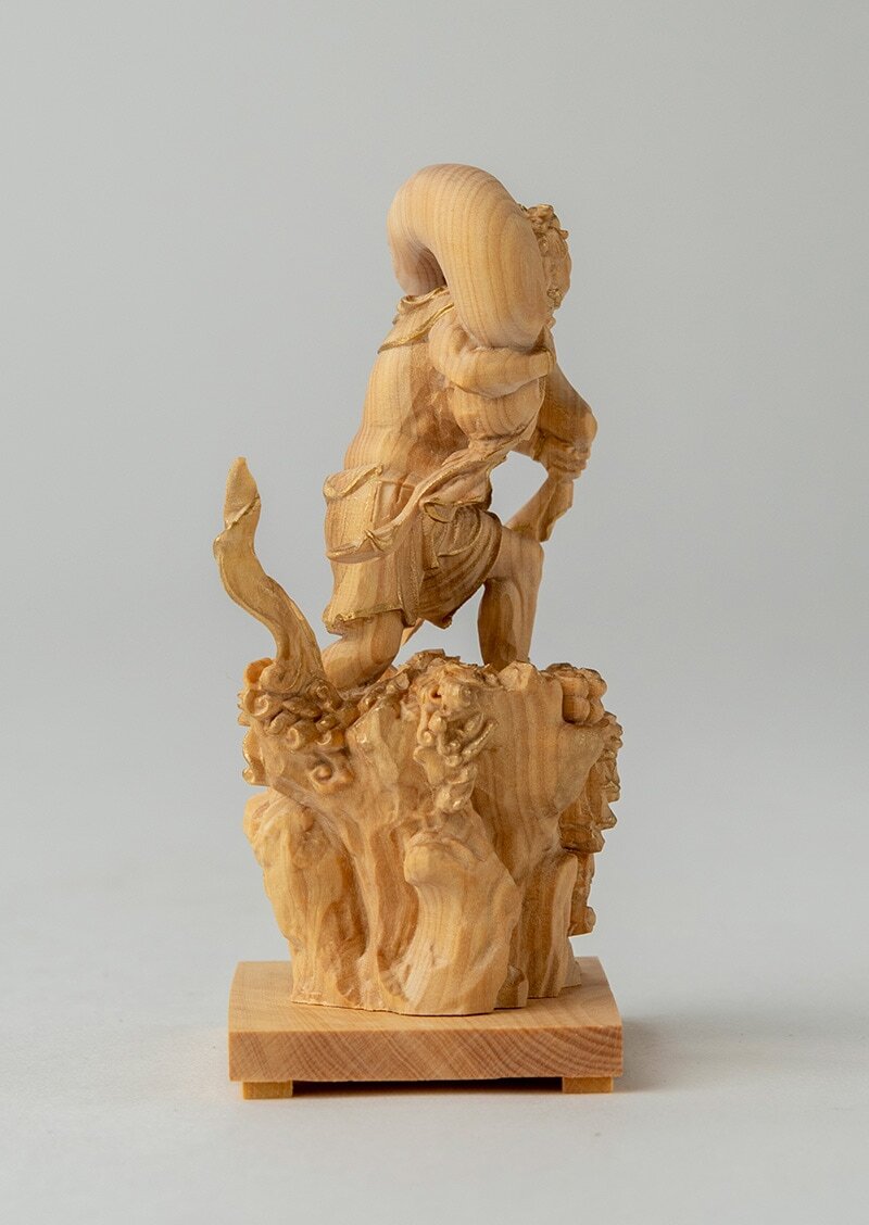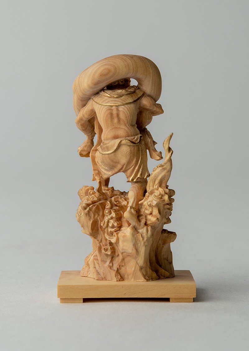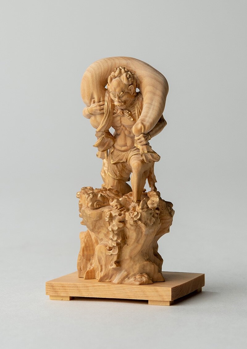 本作は、柘植(つげ)を用いた木彫の風神像です。長年の仏像制作の経験と技術をもとに、小像でありながら実像に近い造形バランスを目指して成形・彫刻されています。とくに顔は像の印象を左右する要所として、実像のイメージに沿って精密に彫り出されています。仕上げの金彩は、高村千尋氏(平野富山に師事し、彩色木彫の系譜を継ぐ彩色家)の監修のもと、イズム工房が担当し、落ち着いた光沢感にまとめています。寺院彫刻で雷神と対で表されることの多い風神像という伝統的な図像を、小品として成立させるための制作として位置づけられたコレクションです。