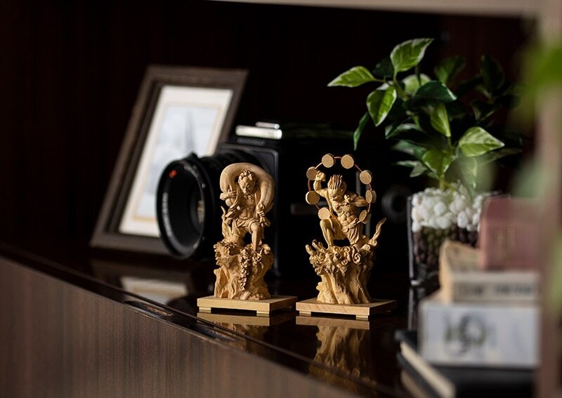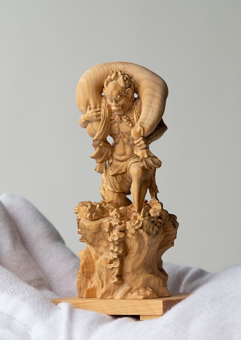 日本では風神は、古くから絵画や寺院の装飾彫刻などに登場する神格で、雷神と並んで表されることも多い存在として親しまれてきました。こうした像は、信仰の対象であると同時に、伝統的な造形表現としても大切に扱われます。お迎えの際は、敬意をもって清潔な場所に置き、目線より高すぎず低すぎない位置で、落ち着いて向き合える環境を整えるのが一般的です。手に取る場合も、乱暴に扱わず、静かな気持ちで接することが望まれます。