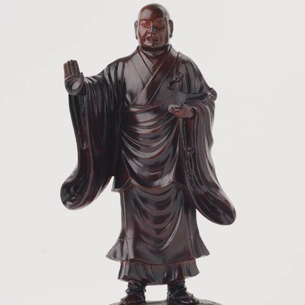 鎌倉時代の僧・日蓮(1222–1282)をかたどった像です。衣のひだや姿勢を端正にまとめ、机上や棚にも収まりやすい寸法感で仕立てています。
