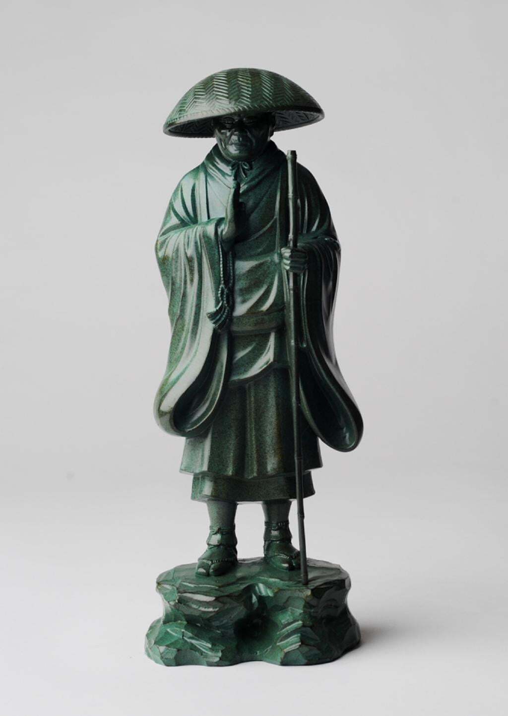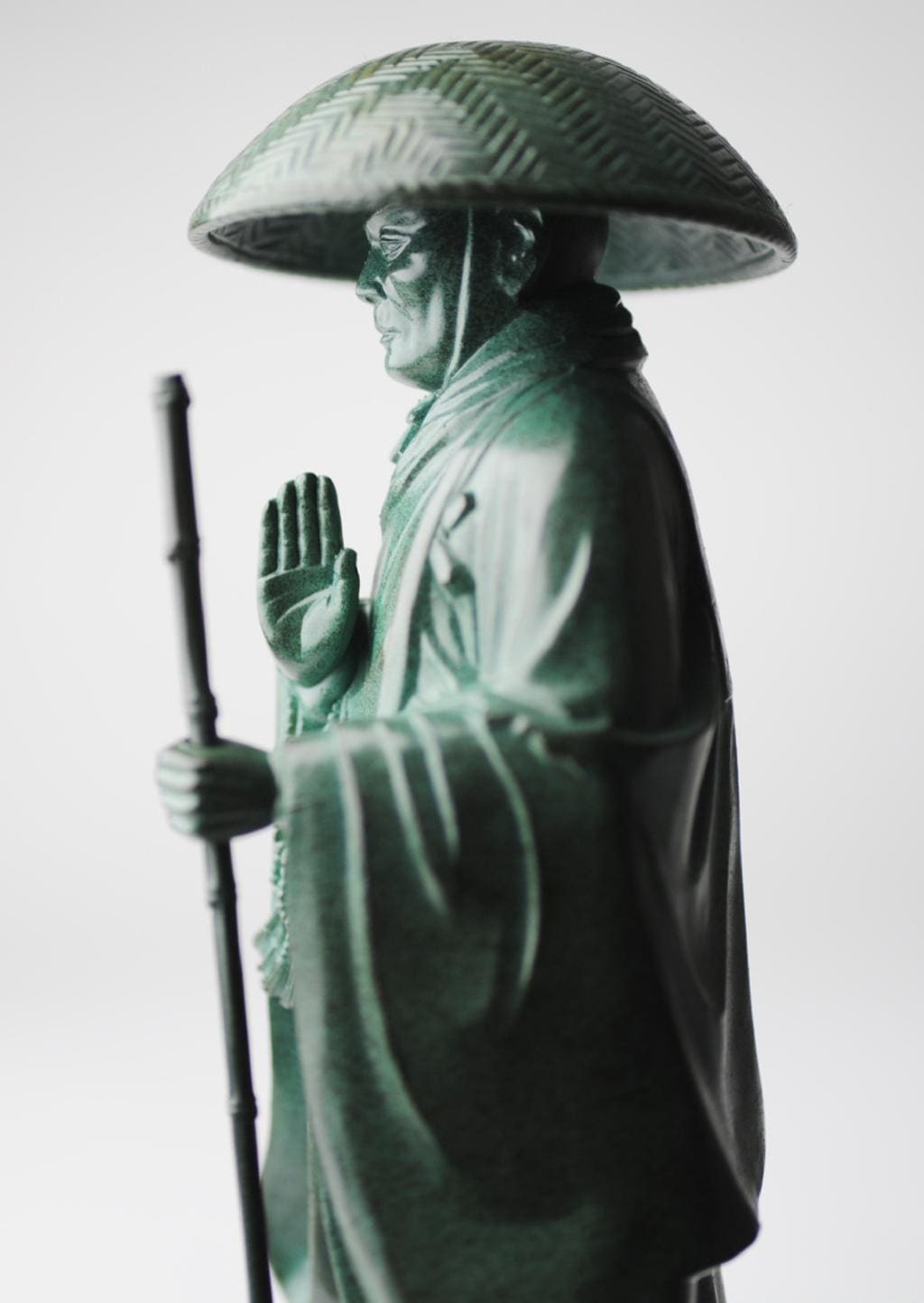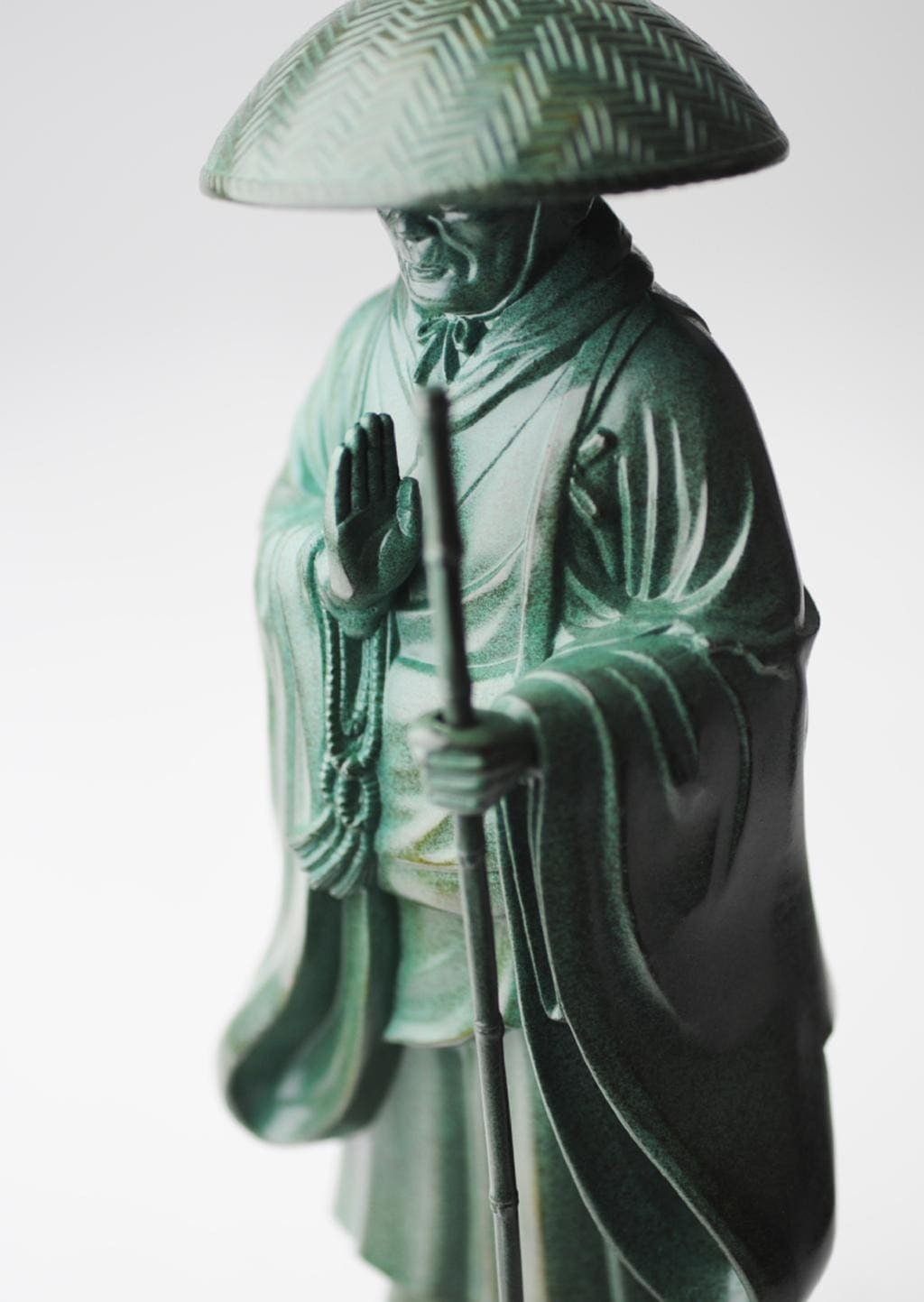 本作は亜鉛合金を用いた鋳造による像で、日本国内で製作されています。親鸞聖人像として伝わる定型(僧形での端正な姿、衣文の流れ、穏やかな面相)を踏まえ、家庭での安置を想定した寸法感にまとめた造形です。寺院や門徒の場で受け継がれてきた肖像表現を参照しつつ、現代の住環境にも収まりやすい仕上がりとして制作されています。