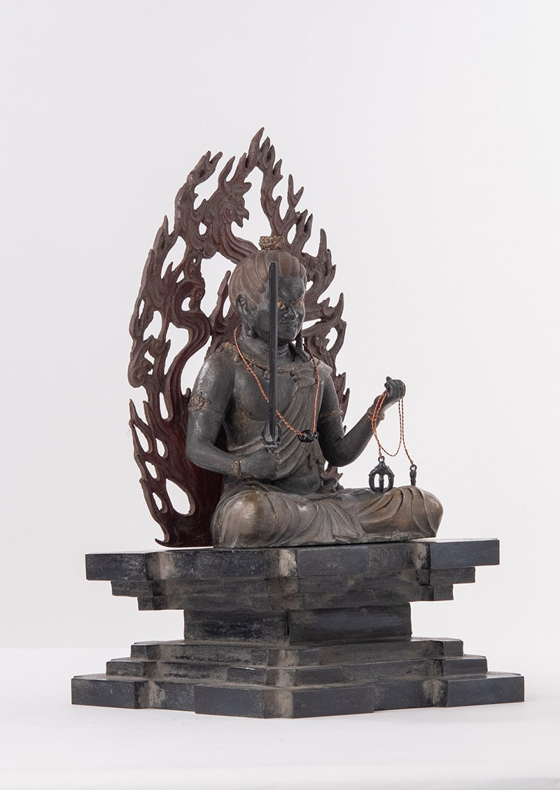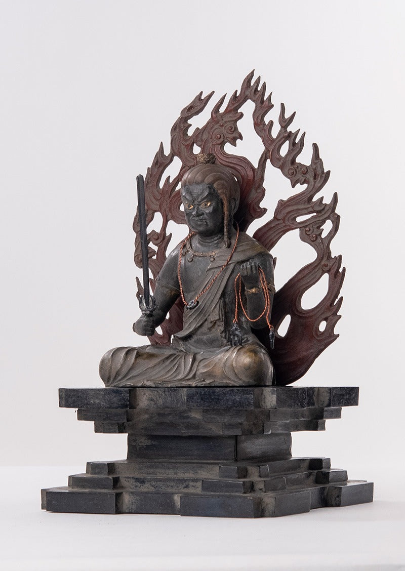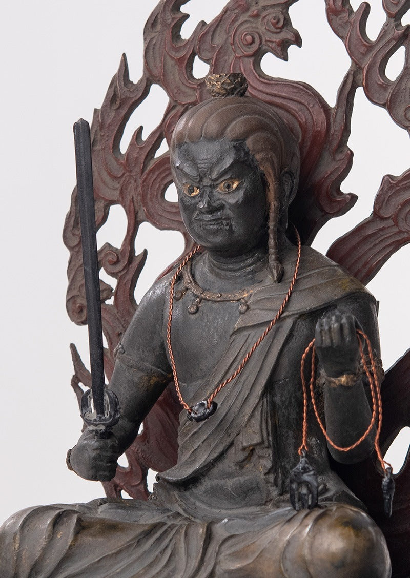 This is a cast bronze statue produced in the Takaoka tradition, where the work is molded, cast, finished, and colored by specialist craftsmen. The model follows the well-known Fudō Myōō attributed to Kaikei (active in the Kamakura period, 1185–1333), an original designated as an Important Cultural Property of Japan. The original design for this replica was commissioned from Mr. Maruyama (丸山明慧), a sculptor of Buddhist icons, and urushi is applied during the final manufacturing stages to articulate different surface qualities across the figure.