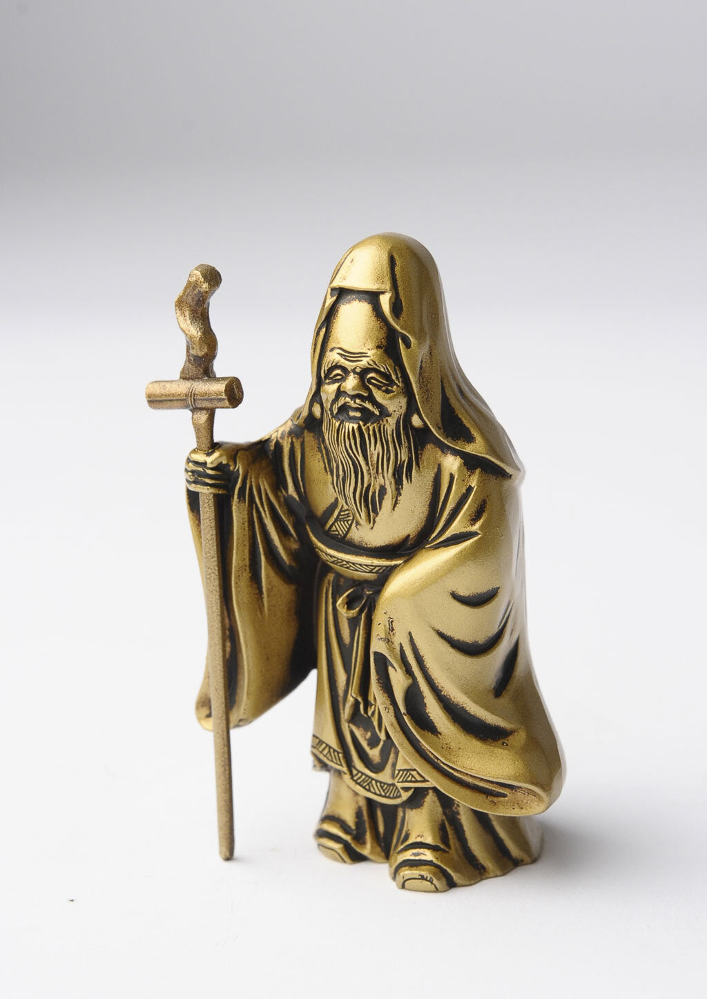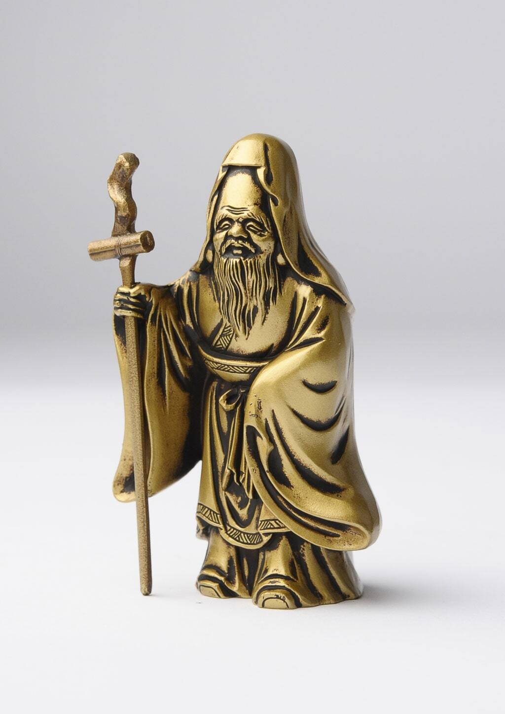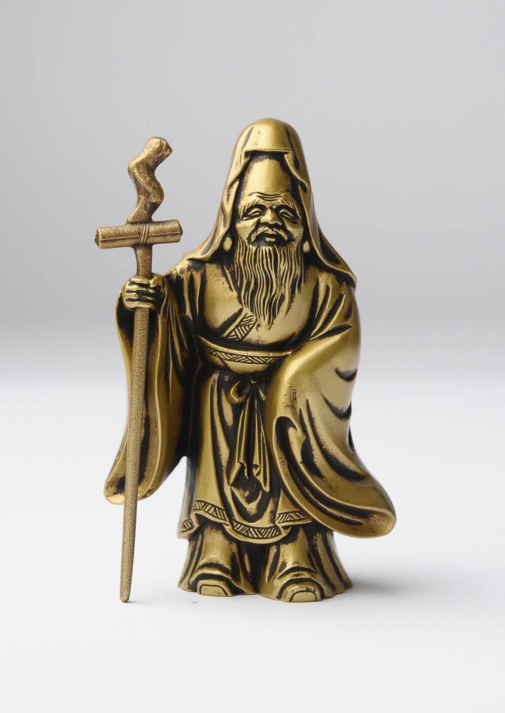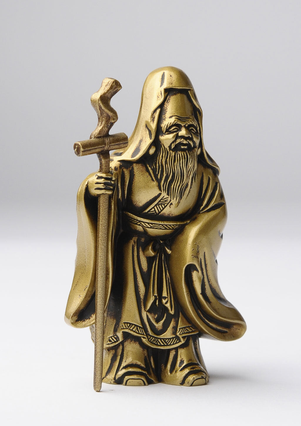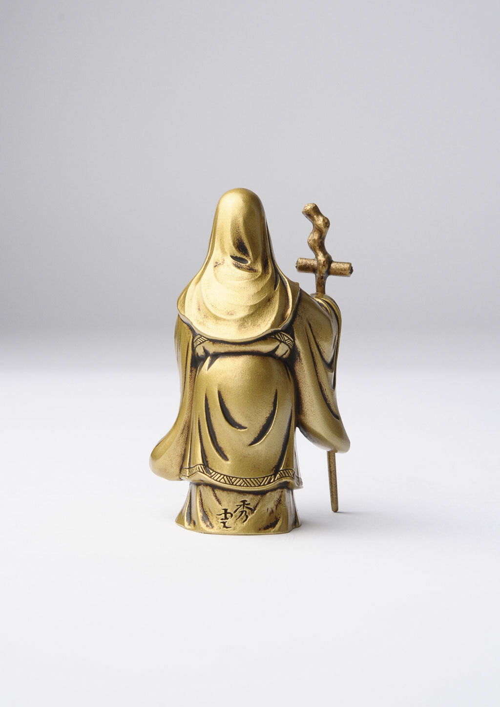 本件作品採用鋅合金鑄造製作,屬於金屬鑄物的成形方式,重點在於輪廓的準確、細部的收邊與表面質地的整合。其製作技法承襲日本富山縣高岡地區延續四百餘年的「高岡銅器」金工傳統,以精密鑄造與細緻修整見長,長期用於宗教造像與各式文化器物。此一福祿壽的造型沿襲日本民間信仰中既有的圖像範式而成,作為七福神之一的定型形象,在工坊體系中反覆被製作與傳承,使其得以以穩定的比例與特徵被保存下來。