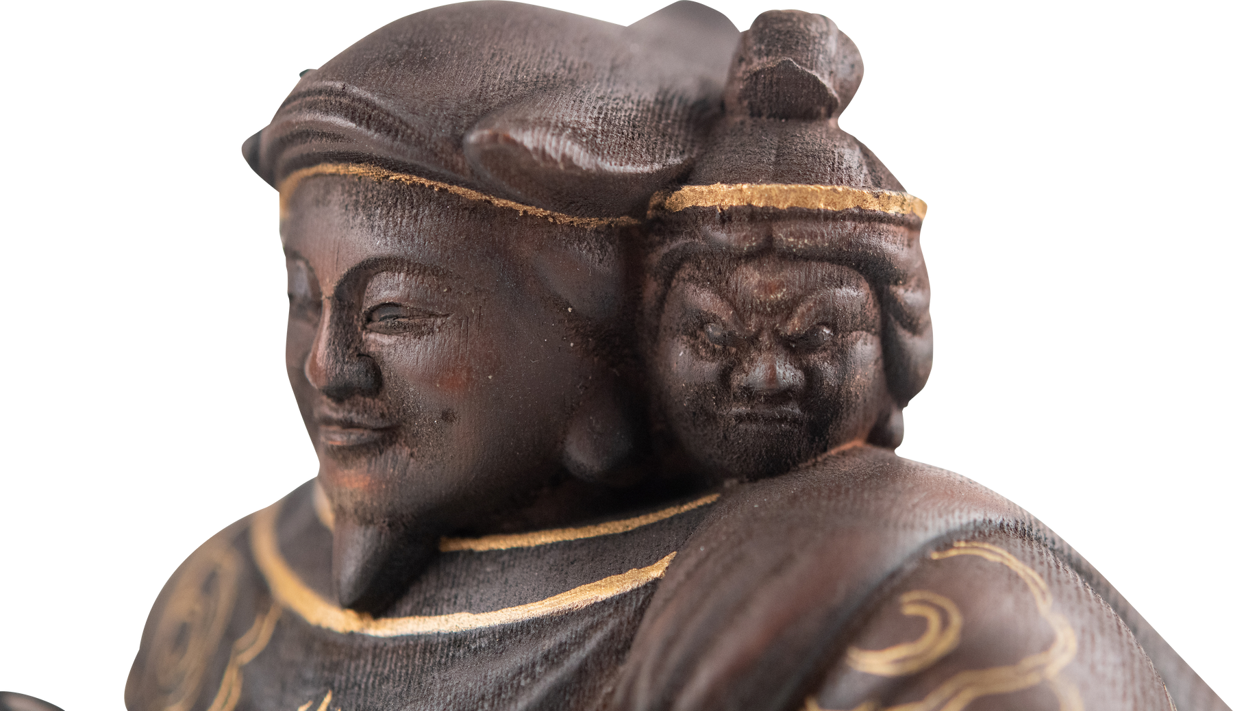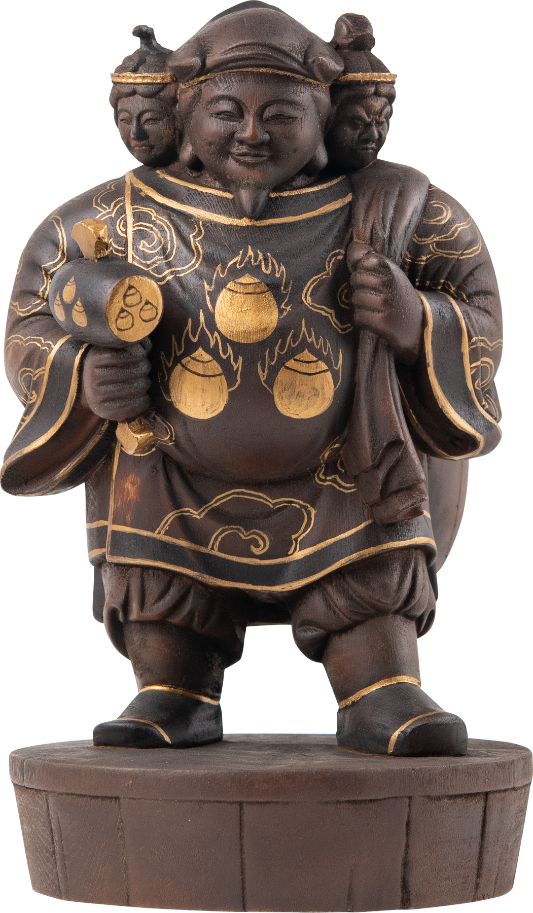 本件為以檜木製作之木雕像,製作流程以四天王寺認證的3D掃描資料精準還原原像的比例、衣褶與細部起伏,再依寺內留存之古護符圖像,重建其「鼎盛時期」的彩色外觀。其模型傳承可追溯至東瀨山 四天王寺所奉安之三面大黑尊天像(寺傳為聖德太子所作),並以寺方保存的明治期資料作為形制參照;此一復刻形式的存在,源於寺院對傳世尊像之保存與傳承需求,透過數位測繪與彩繪考證,讓現代作品得以在形制上貼近所傳原型。
